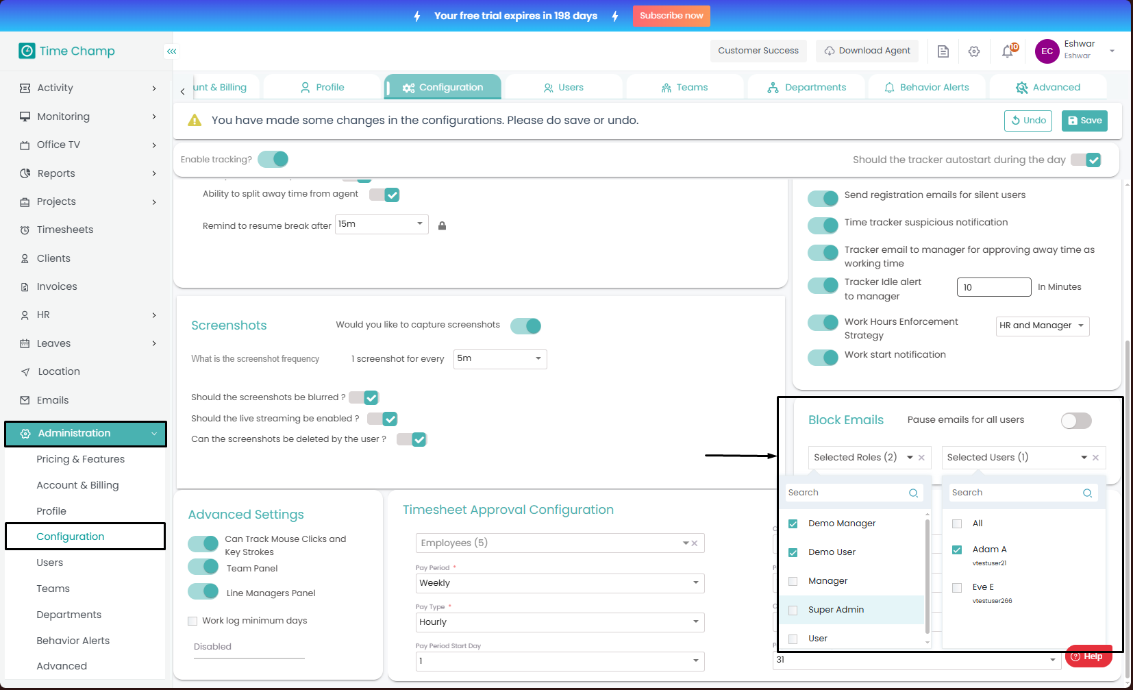 Sends an email to the specified users and roles selected in the dropdown menu regarding work hour configurations.