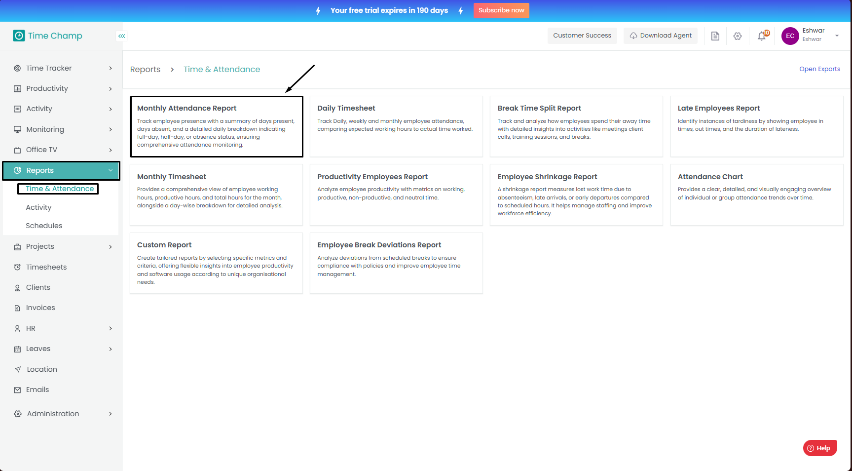 Navigate to the Reports Module and then to the Time and Attendance section.