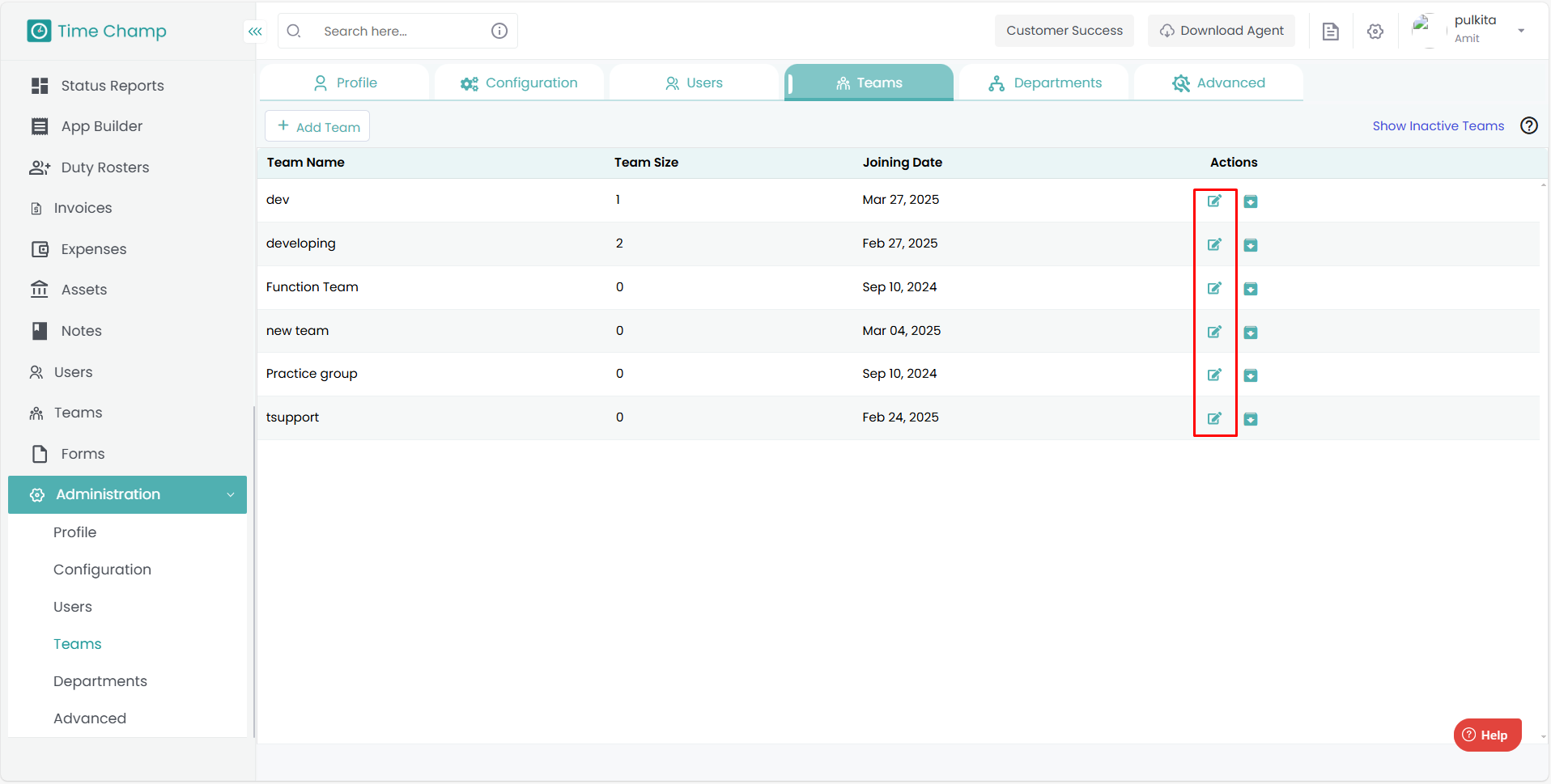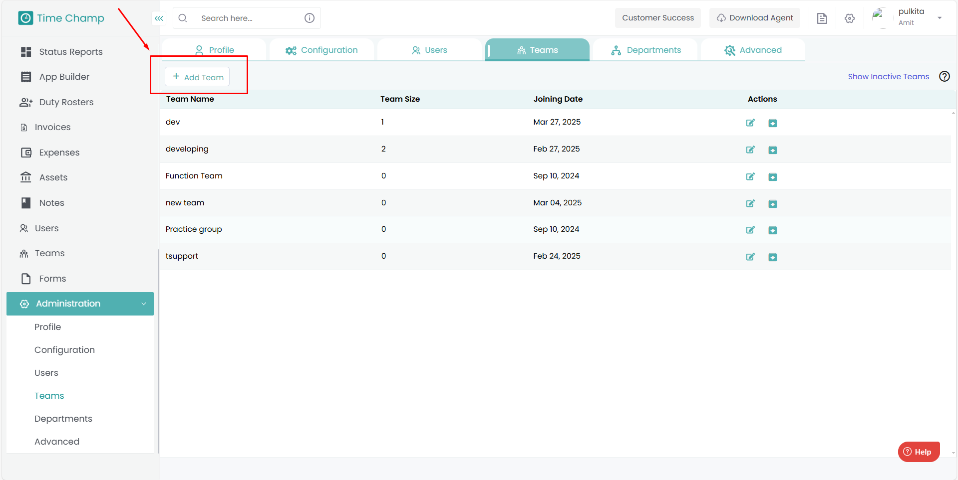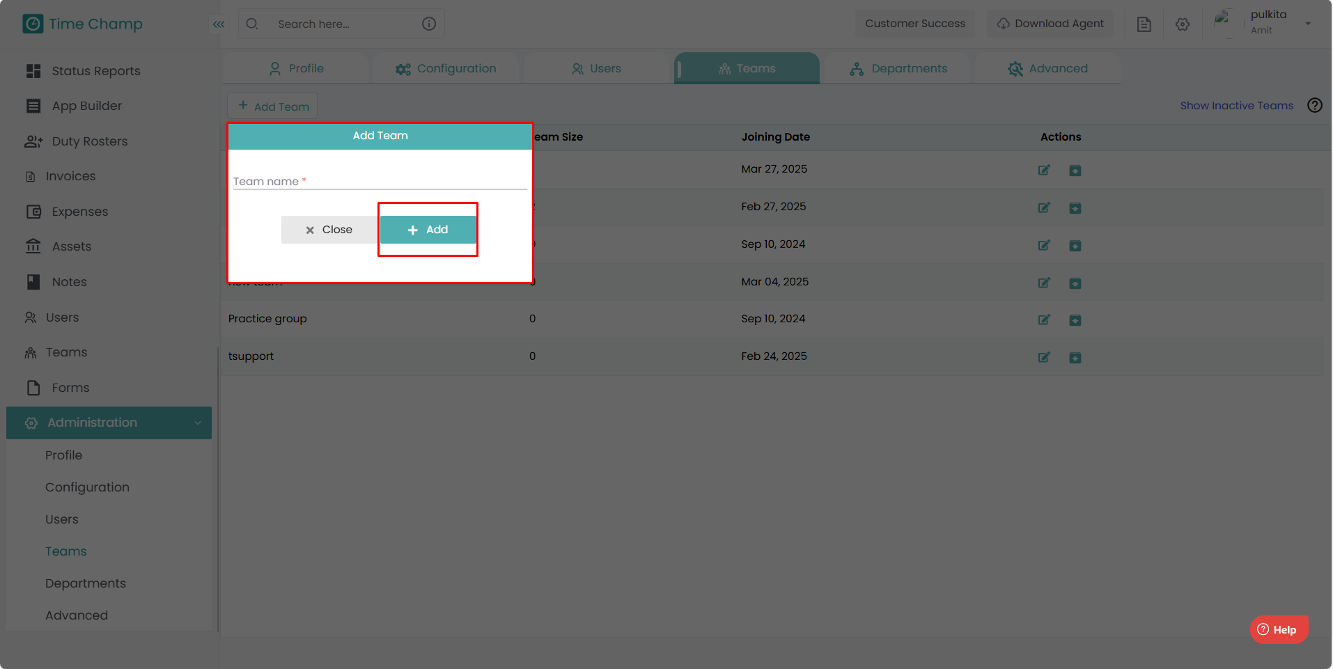 Follow the steps below to create a new team and manage team members under the Administration module: