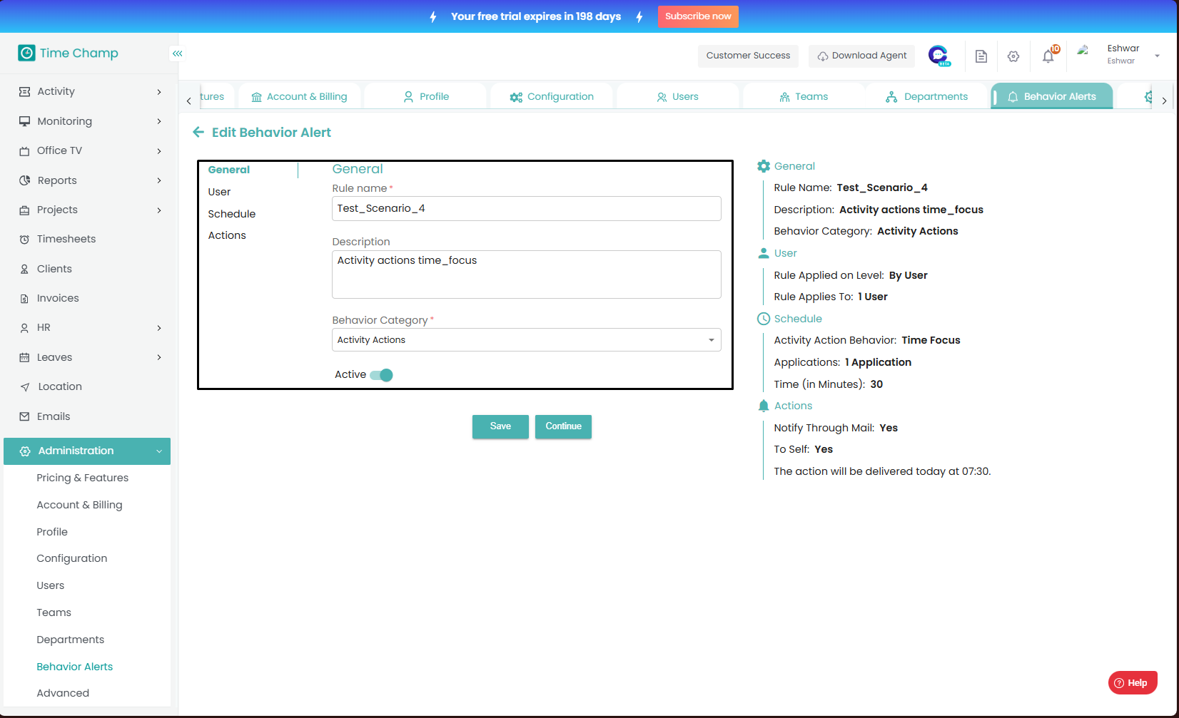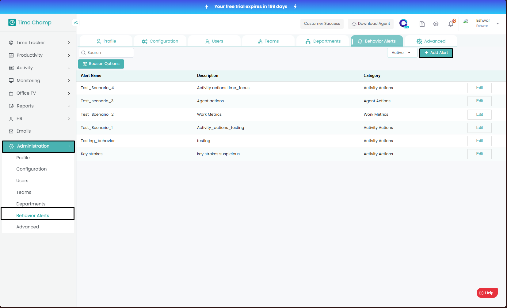 Follow the steps to edit a behavior alert. Step 1: Log into the site utilizing your credentials. Step 2: Navigate to the Administration Module and then to the Behavior alerts section. Step 3: Click on edit as show in the highlighted area in the below ...