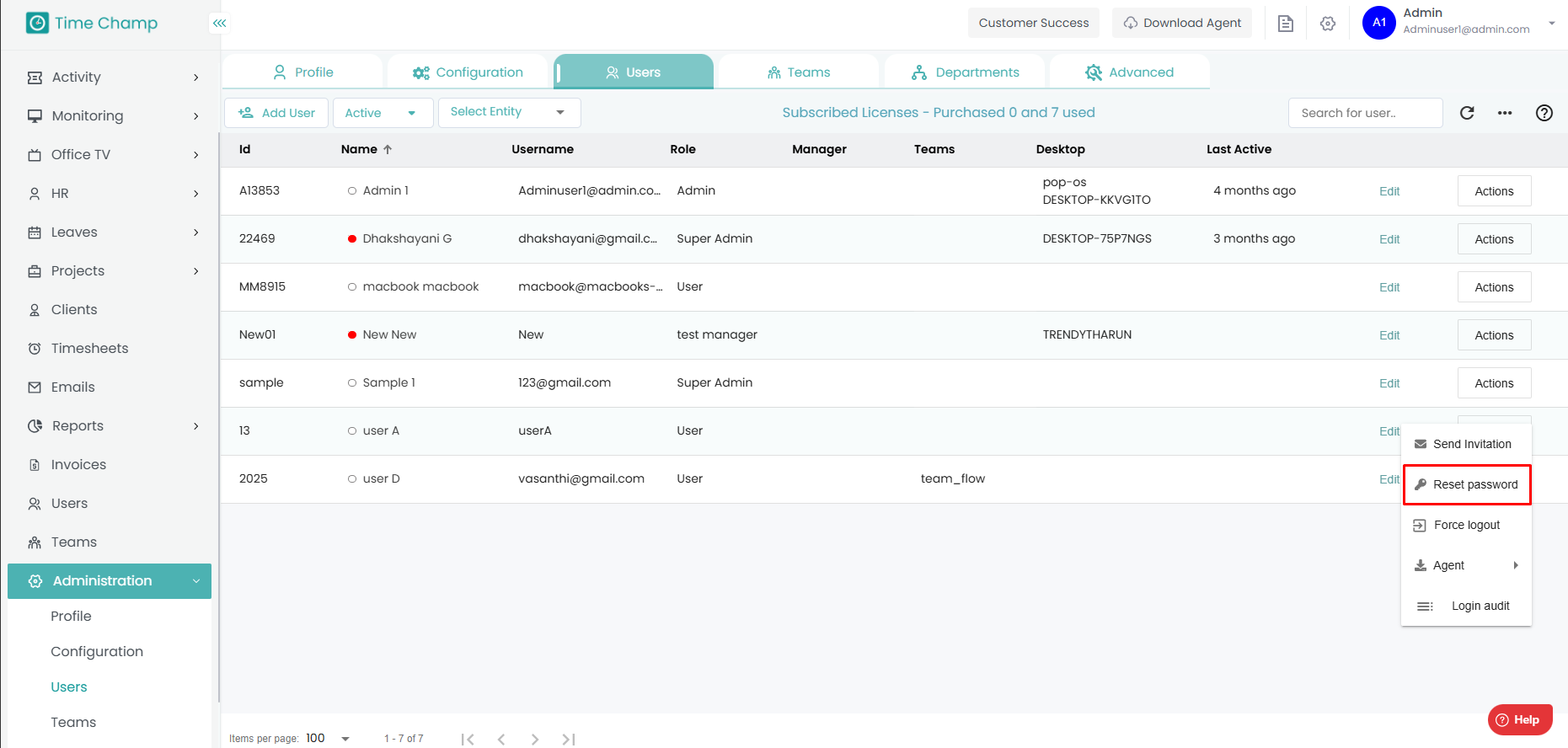 To reset the password, Click on Actions tab.