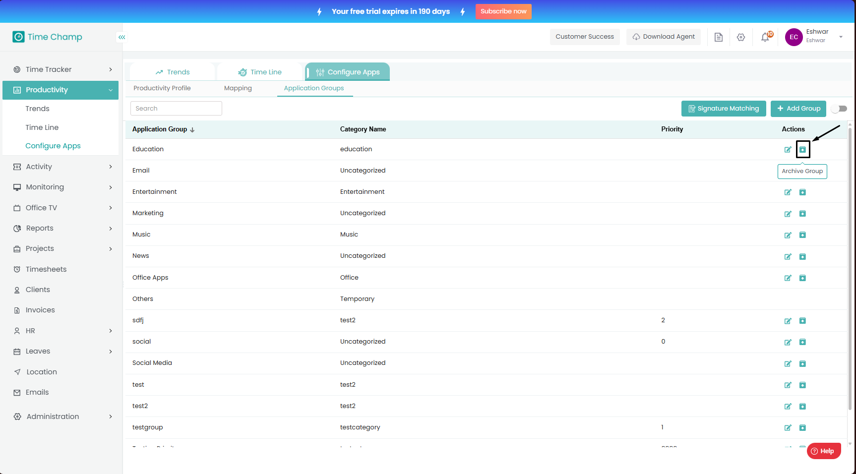 Follow the steps to unarchive an Application Group. Step 1: Log into the site utilizing your credentials. Step 2: Navigate to the Productivity Module and then to the Configure Apps section. Step 3: Navigate to the Application Groups Sub Section as ...