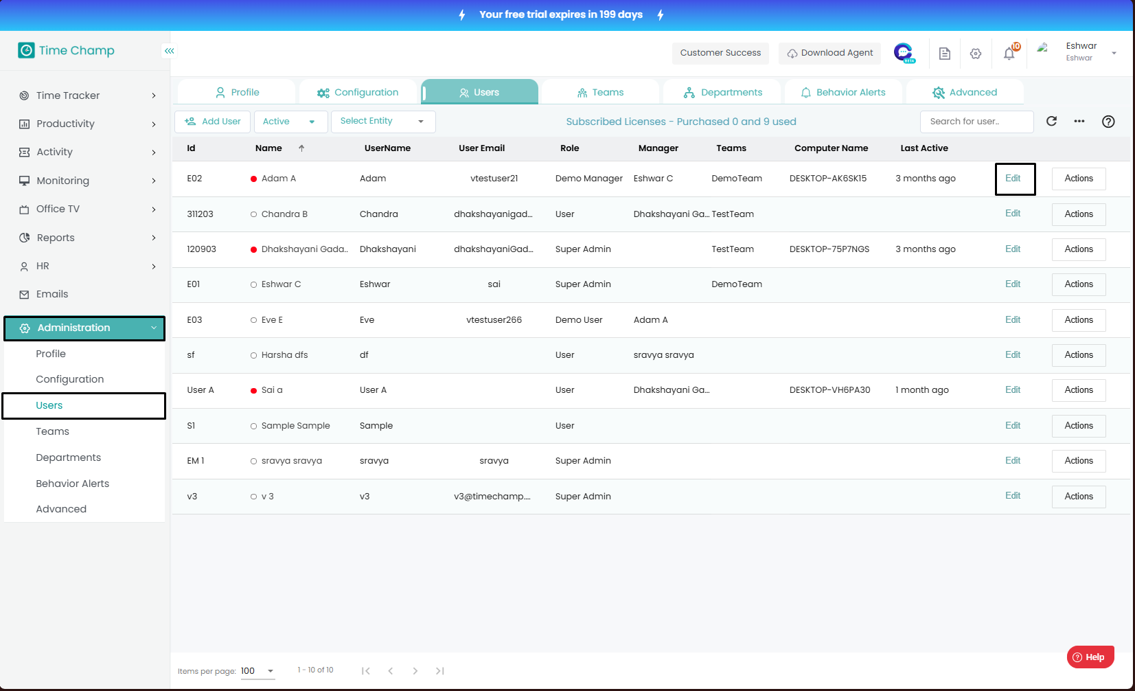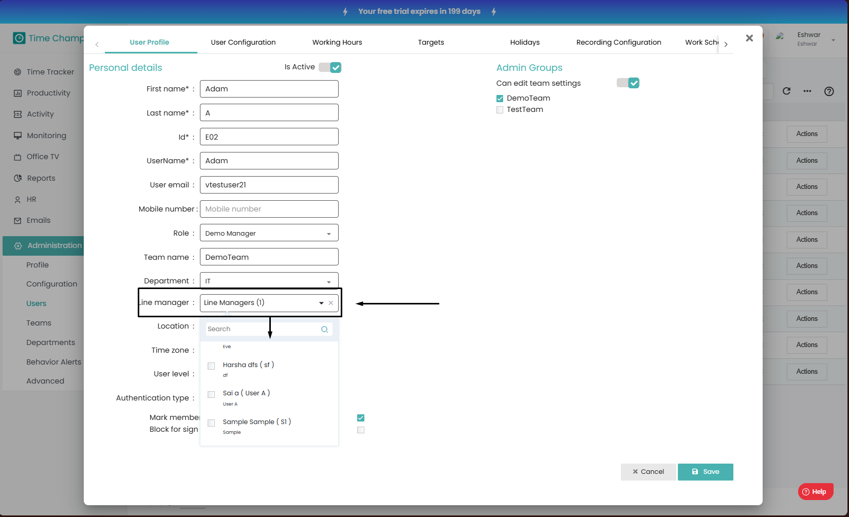 How to Edit User details (Name, User ID, Username, User Email, Mobile Number, Role, Team Name, Department, Line Manager, Location, Time Zone)?
