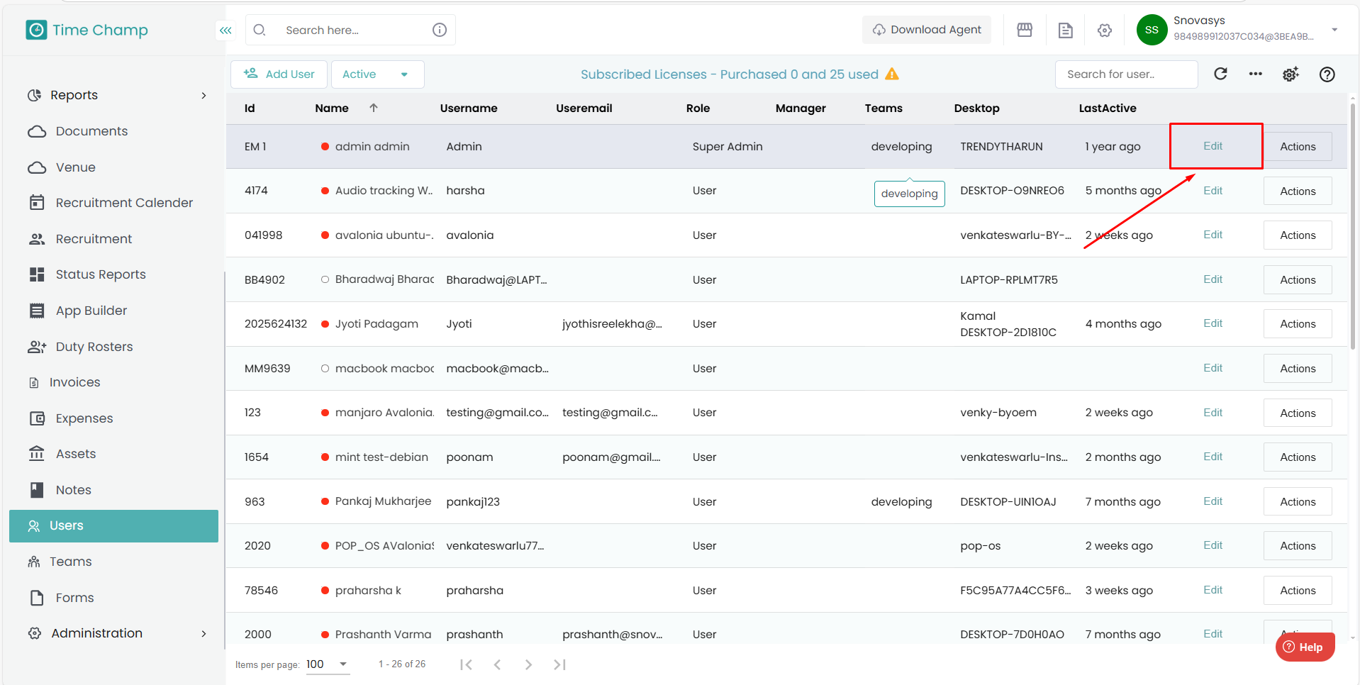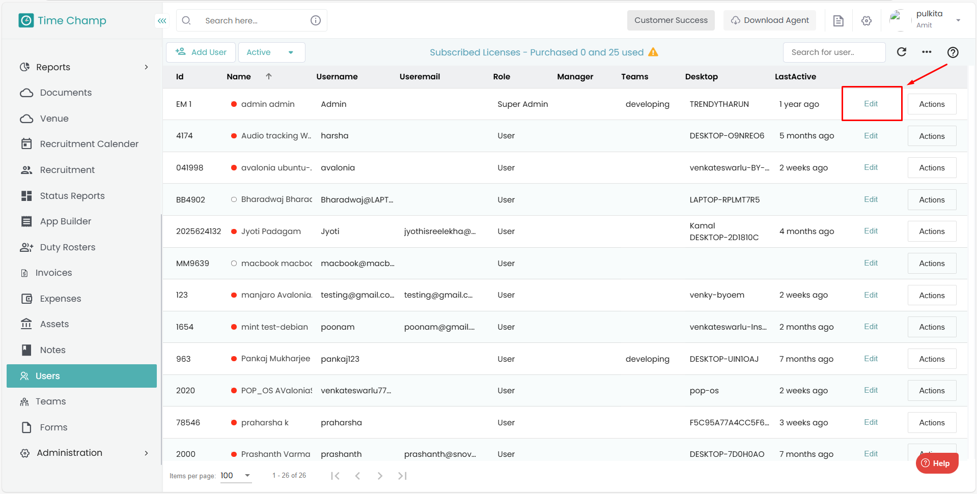 Edit option beside each employee’s username.
