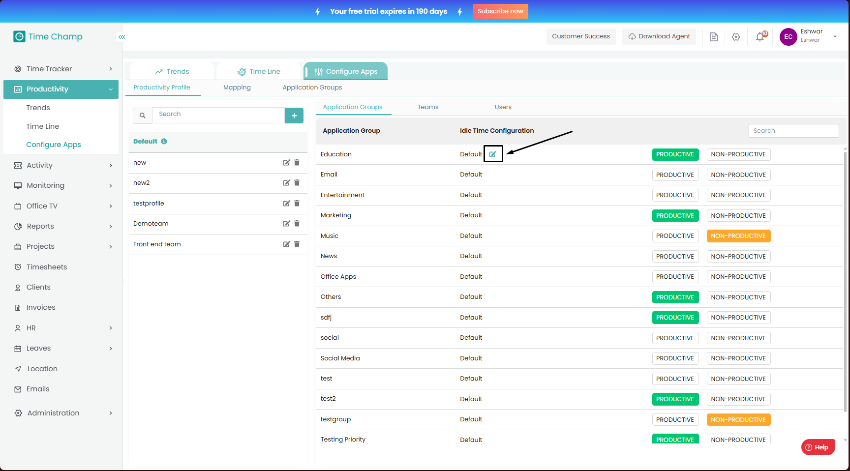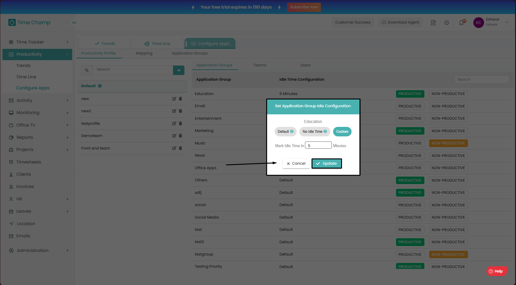 How to change the idle time for applications or sites present within an application group in a productive profile?