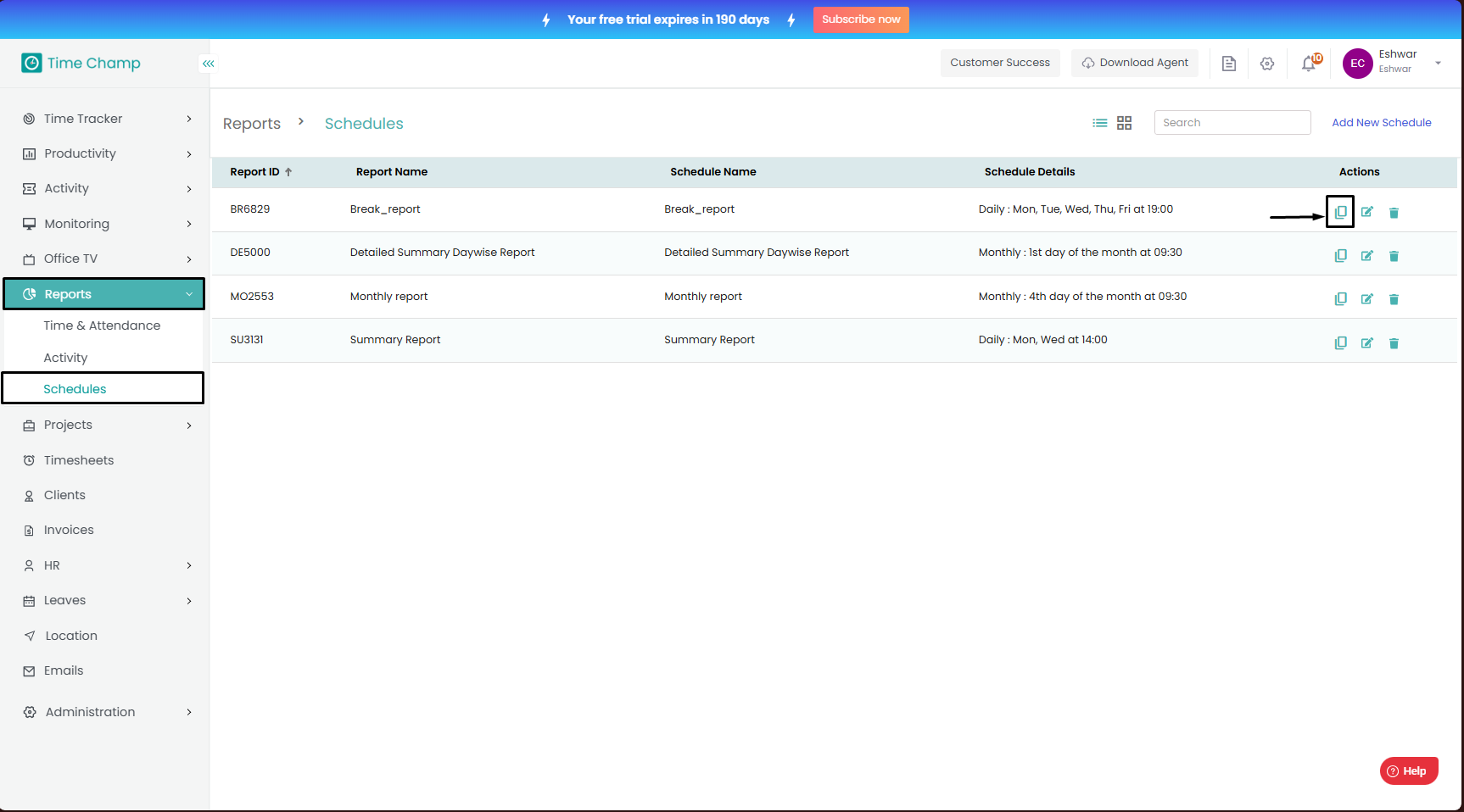 Follow the steps to edit a Schedule. Step 1: Log into the site utilizing your credentials. Step 2: Navigate to the Reports Module and then to the Schedules section. Step 3: Click on edit as shown in the highlighted area in the below image to make ...