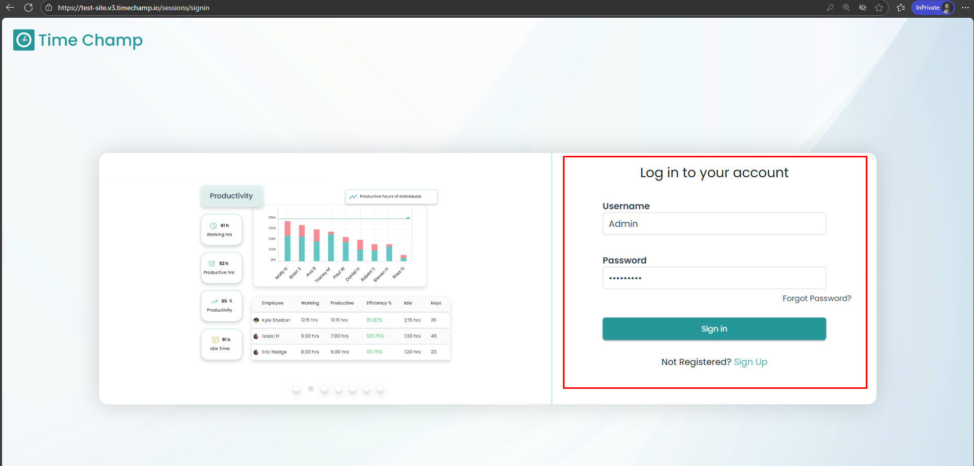 Open the Time Champ site and log in using your Username and Password.