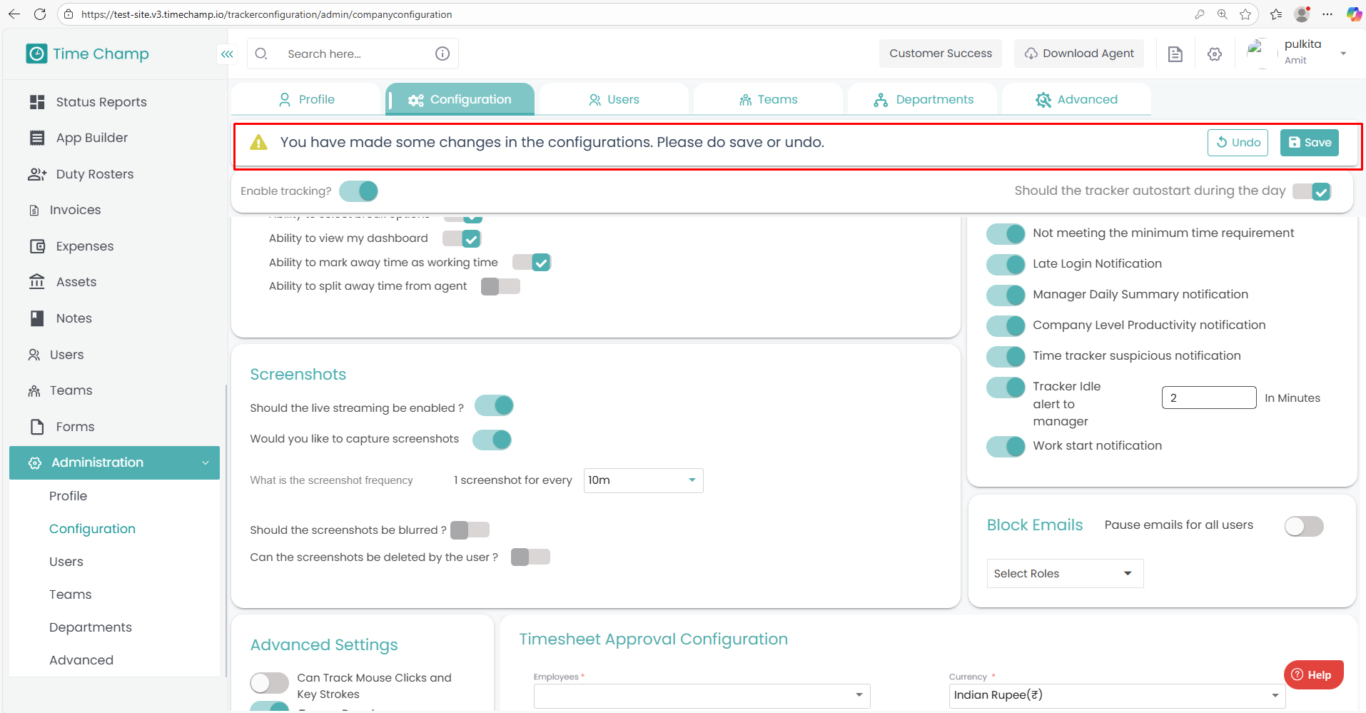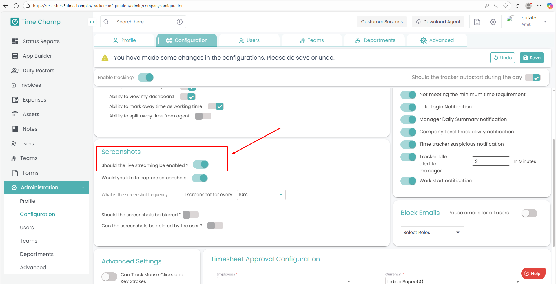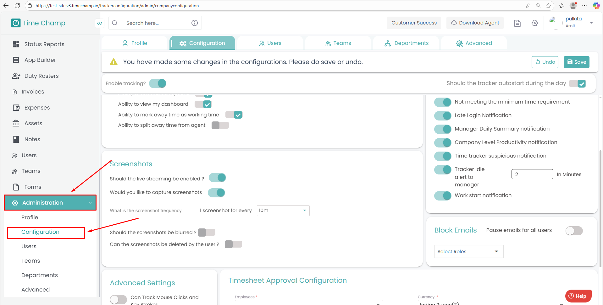 Follow the steps below to configure Screenshots in the Time Champ portal: Step 1: Open the Time Champ site and log in using your Username and Password. Once logged in, navigate to the bottom-left corner of the dashboard. Click on Administration. ...