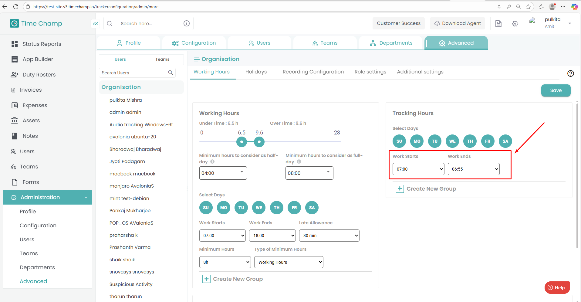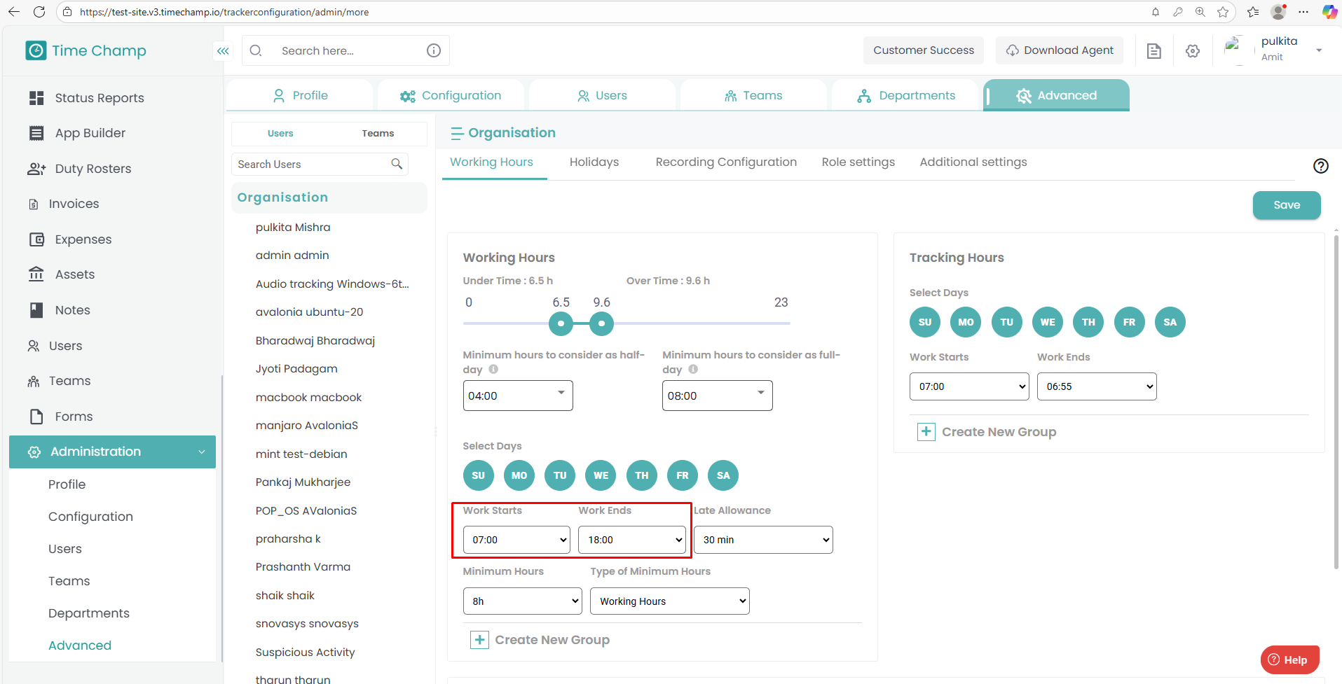 Similarly, update the Tracking Hours section with the same Work Starts and Work Ends values.