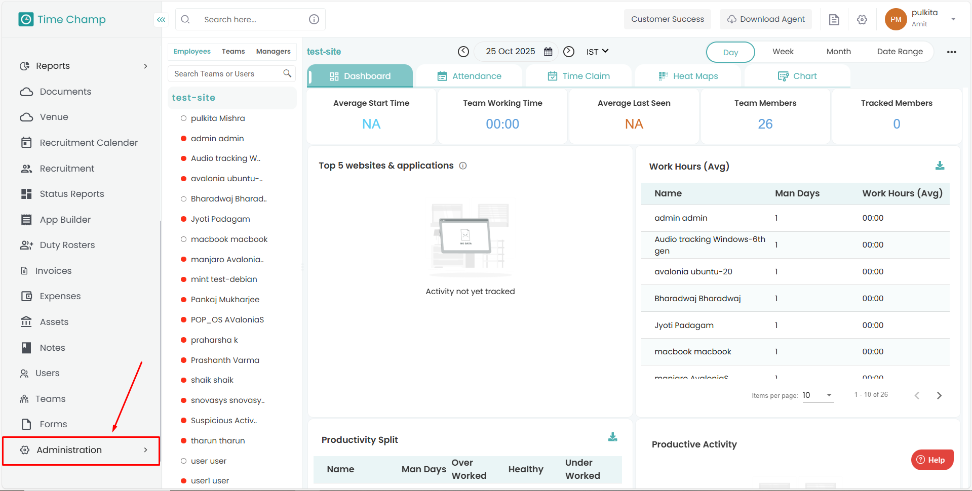 Follow the steps below to configure Screenshots in the Time Champ portal: Step 1: Open the Time Champ site and log in using your Username and Password. Once logged in, navigate to the bottom-left corner of the dashboard. Click on Administration. ...