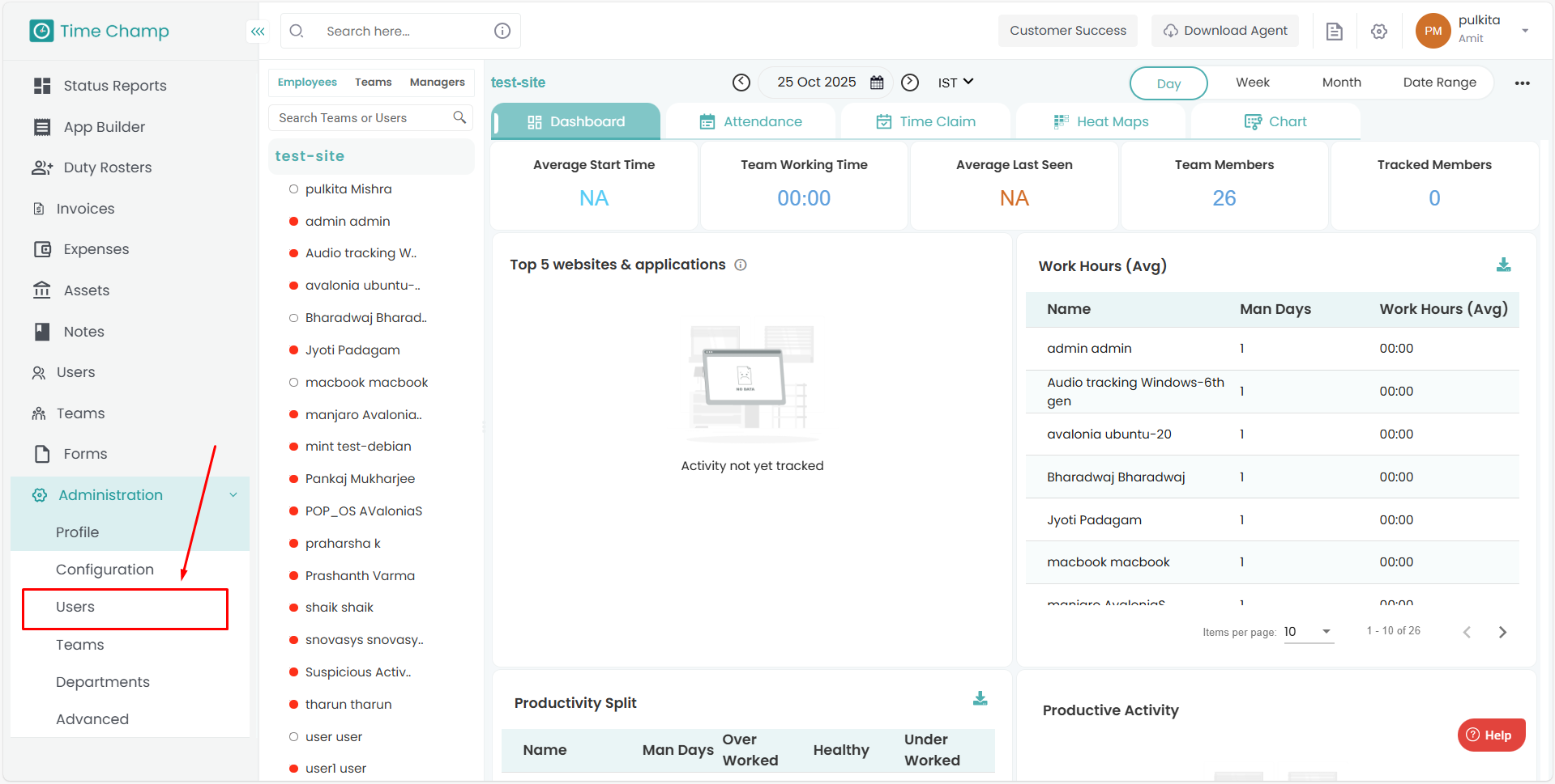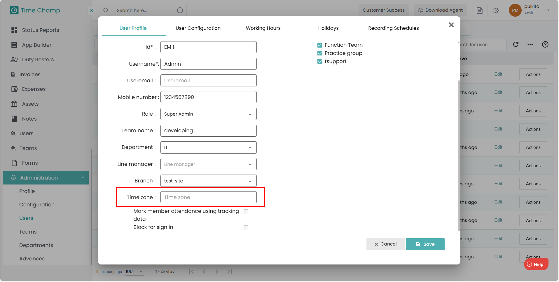 Follow the steps below to access and modify user-level configurations under the Administration module: Step 1: Log in to your Time Champ account. From the left-hand menu, click on the Users module. Step 2: Click on the Edit option beside the name of ...