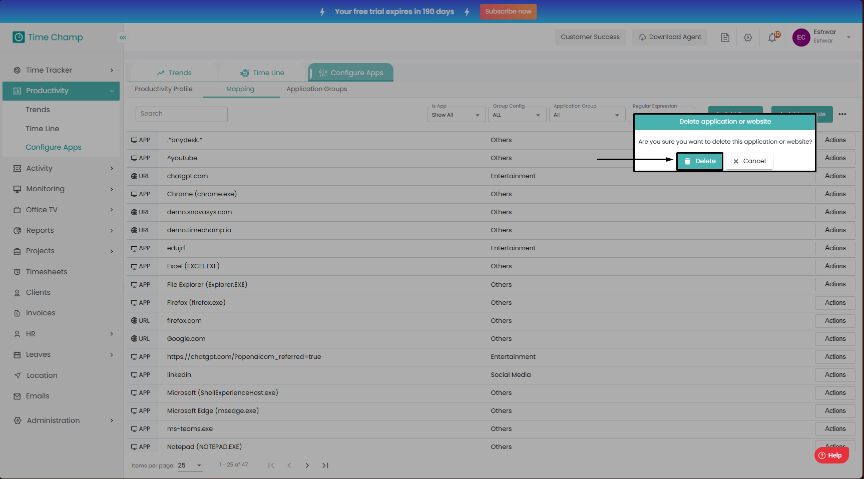 Follow the steps to delete a mapped application/URL.