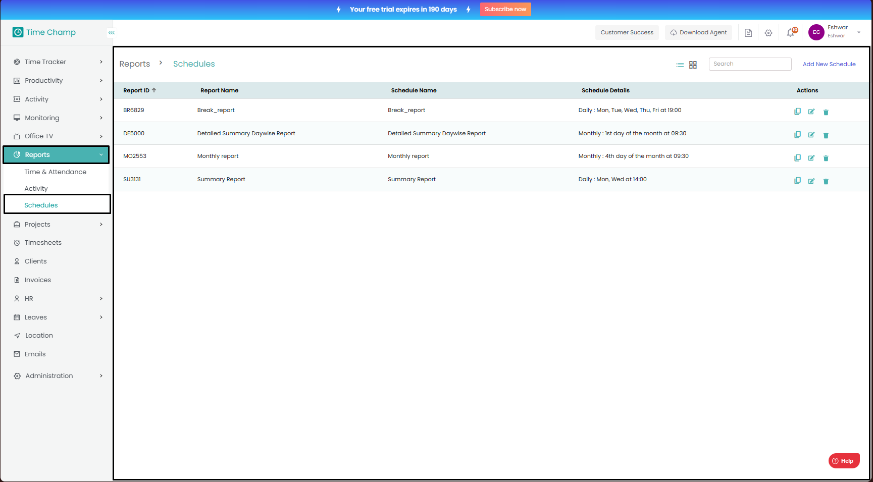 Follow the steps to add a Schedule. Step 1: Log into the site utilizing your credentials. Step 2: Navigate to the Reports Module and then to the Schedules section. Step 3: Click on add new Schedule as shown in the highlighted area in the below image. ...