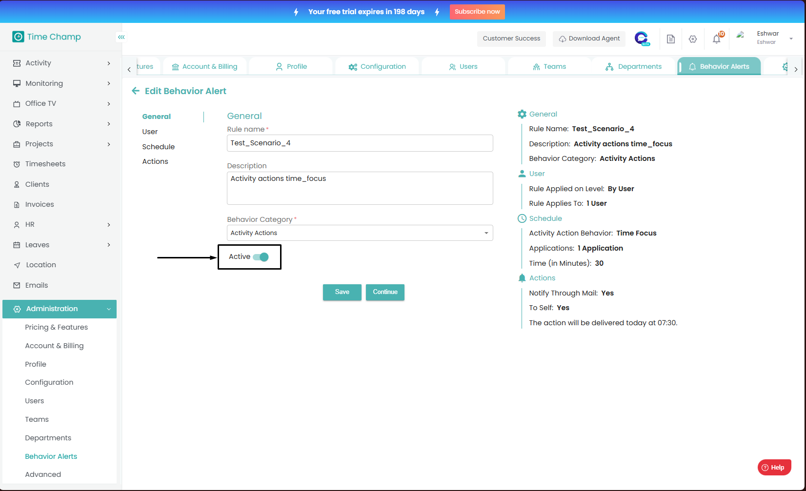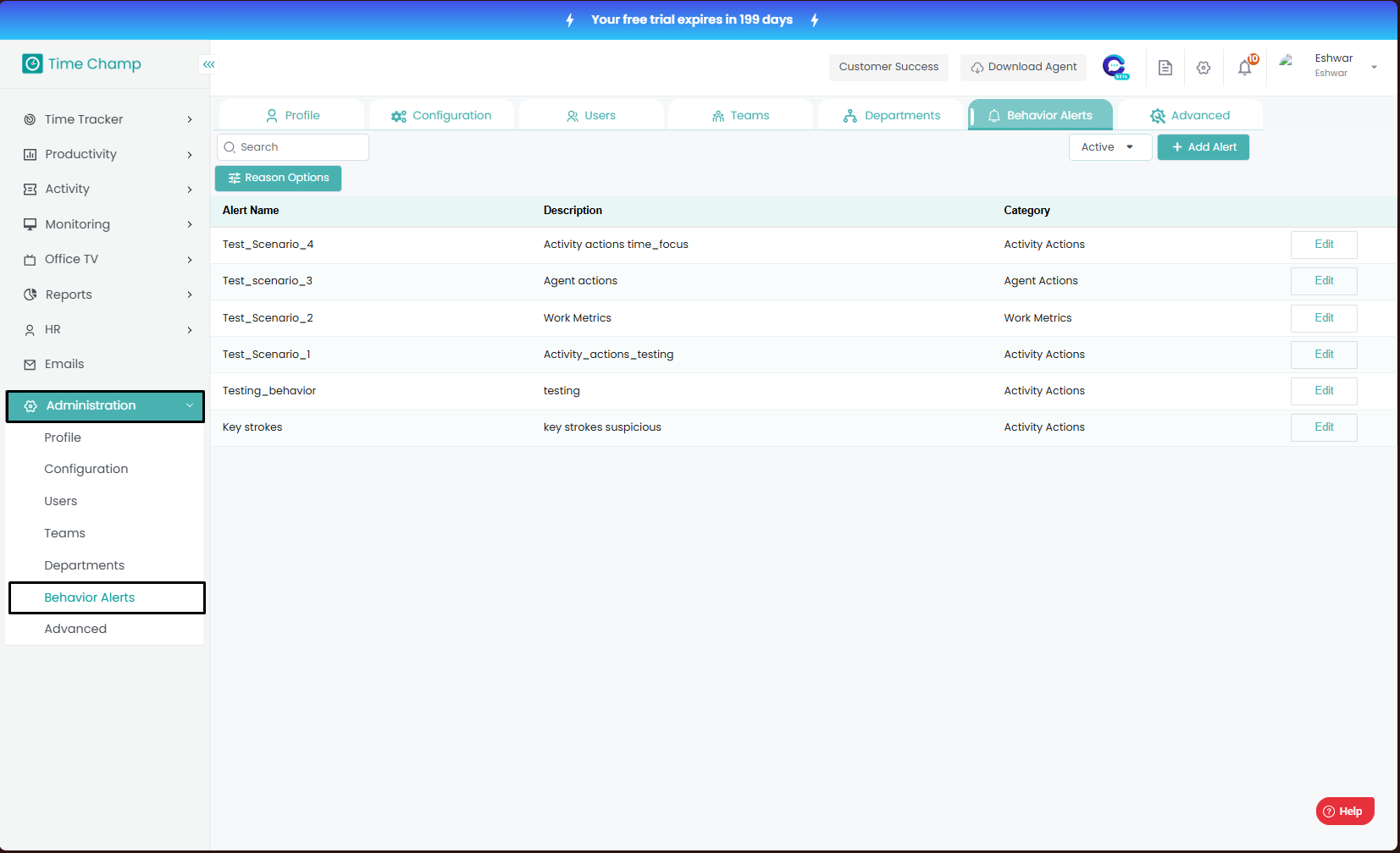Follow the steps to edit a behavior alert. Step 1: Log into the site utilizing your credentials. Step 2: Navigate to the Administration Module and then to the Behavior alerts section. Step 3: Click on edit as show in the highlighted area in the below ...