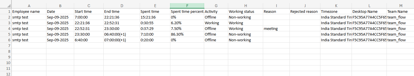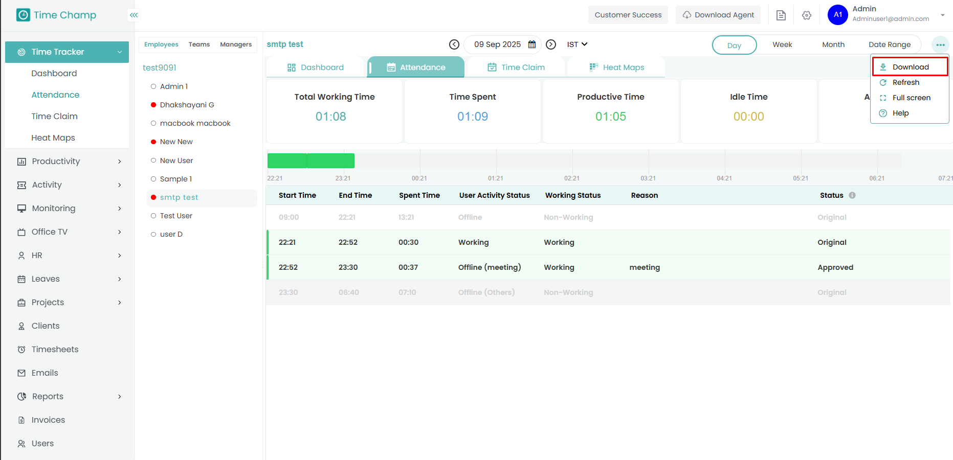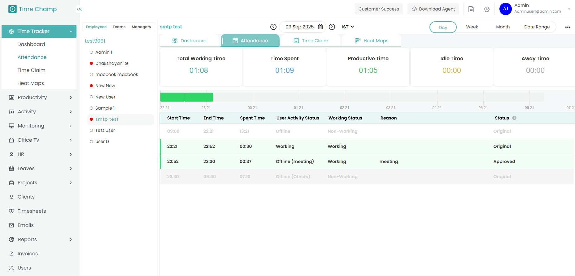 Step 1: Login to your Time champ account with credentials. Step 2: Navigate to Time tracker. Step 3: Navigate to Attendance tab. You can see some widgets- Total Working Time: The time the user spent working on the system. Time spent: Time spent by ...