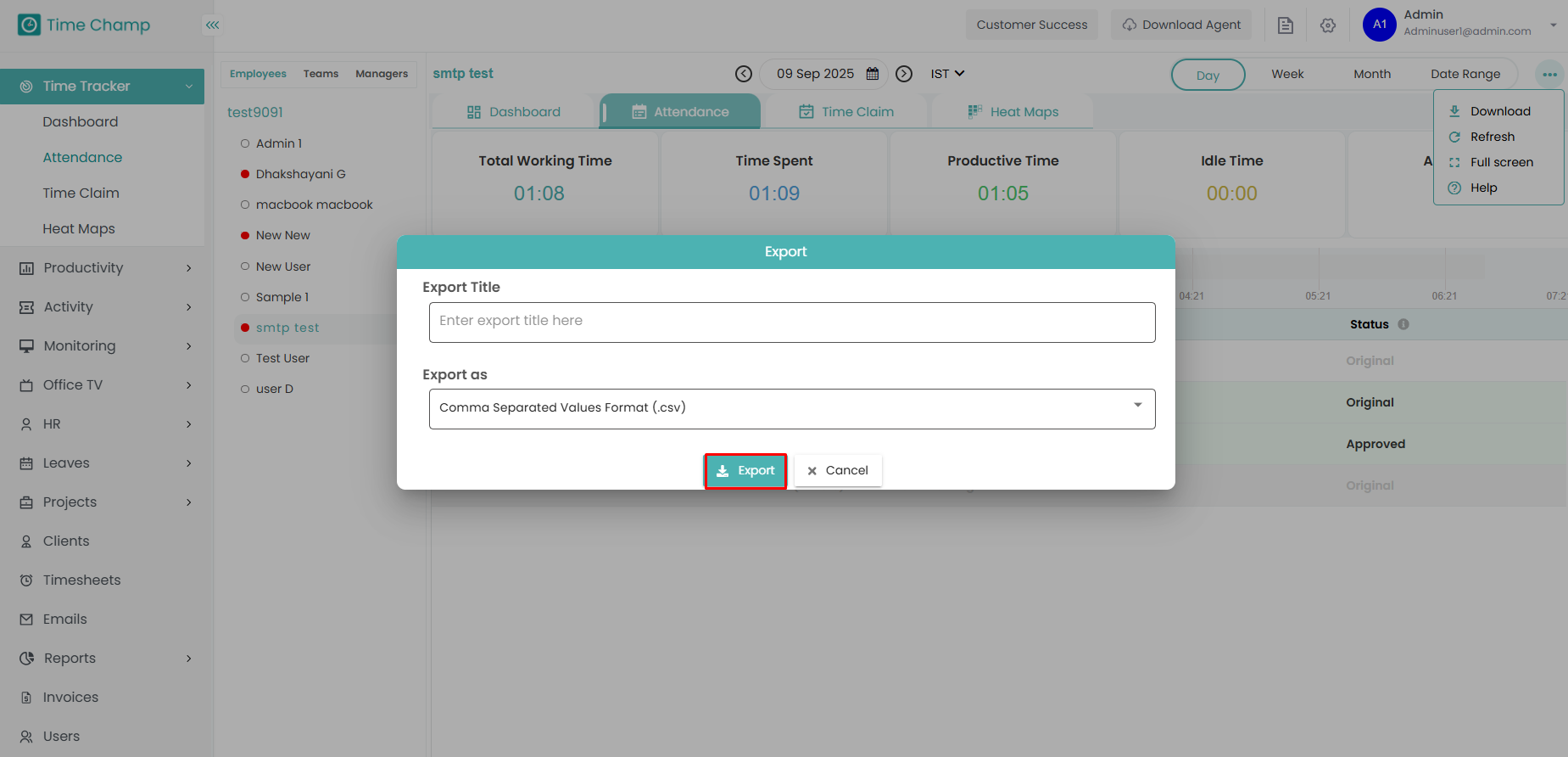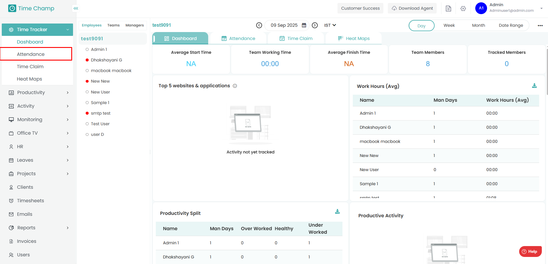 Step 1: Login to your Time champ account with credentials. Step 2: Navigate to Time tracker. Step 3: Navigate to Attendance tab. Step 4: Select organization in the user level. Team Count: The total number of members in the organization. On Leave: It ...