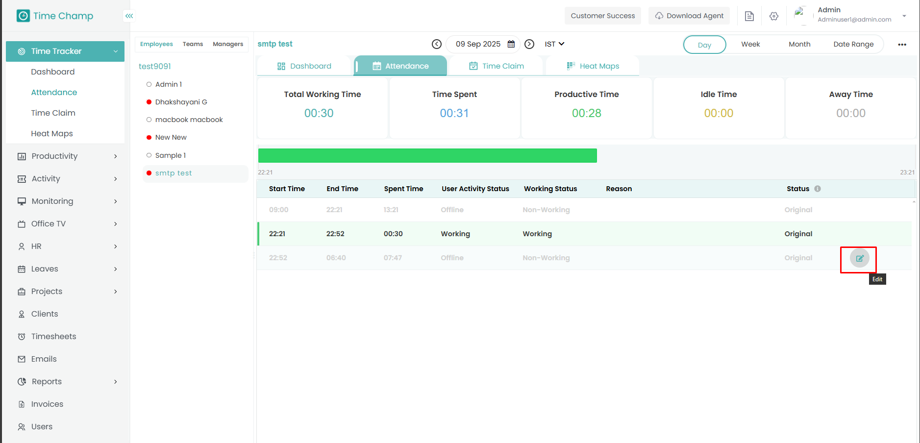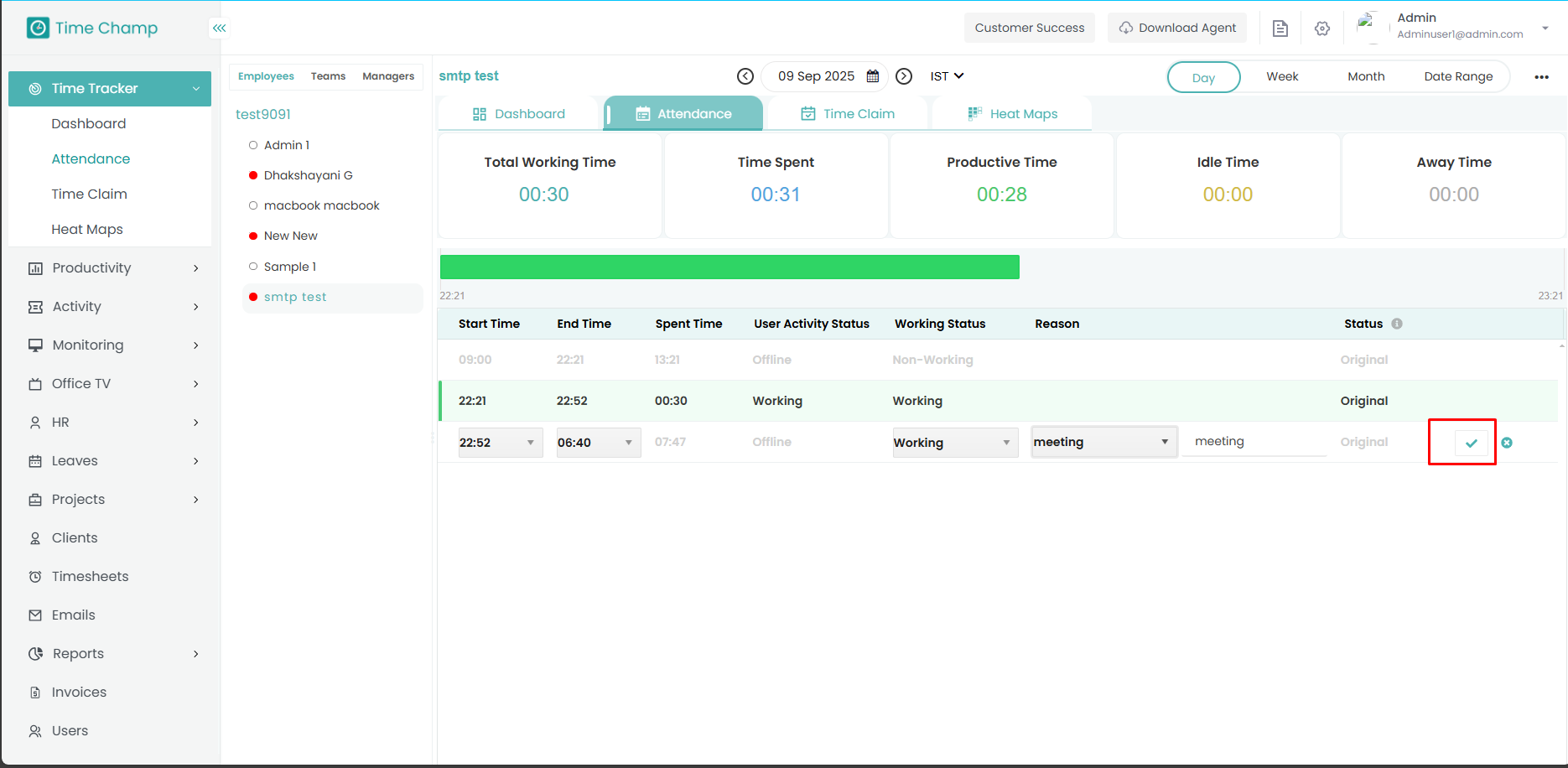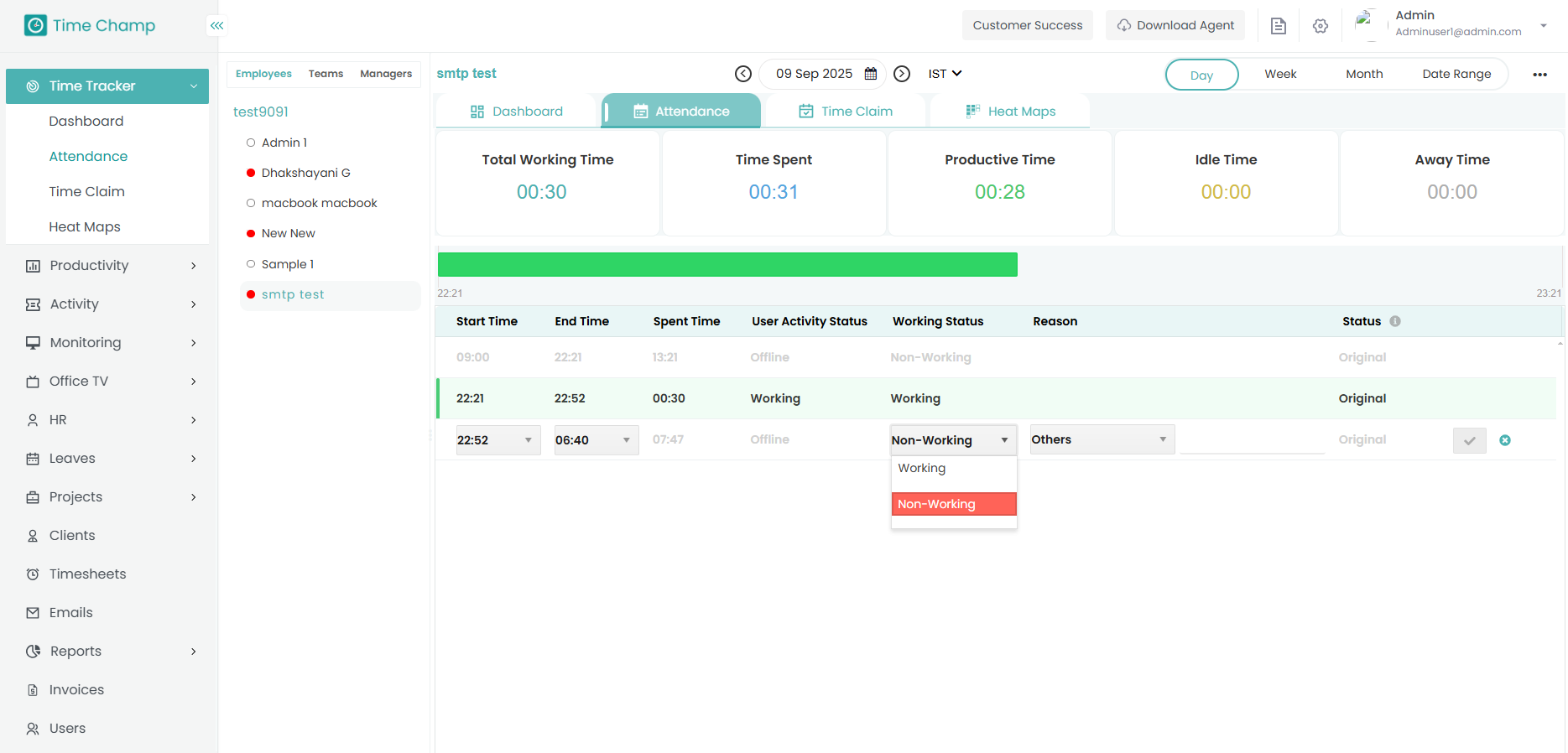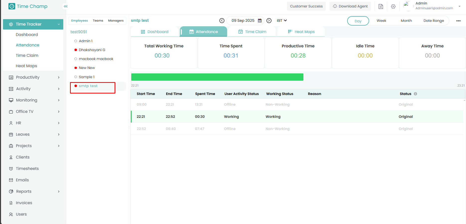 Step 1: Login to your Time champ account with credentials. Step 2: Navigate to Time tracker. Step 3: Navigate to Attendance tab. You can see some widgets- Total Working Time: The time the user spent working on the system. Time spent: Time spent by ...