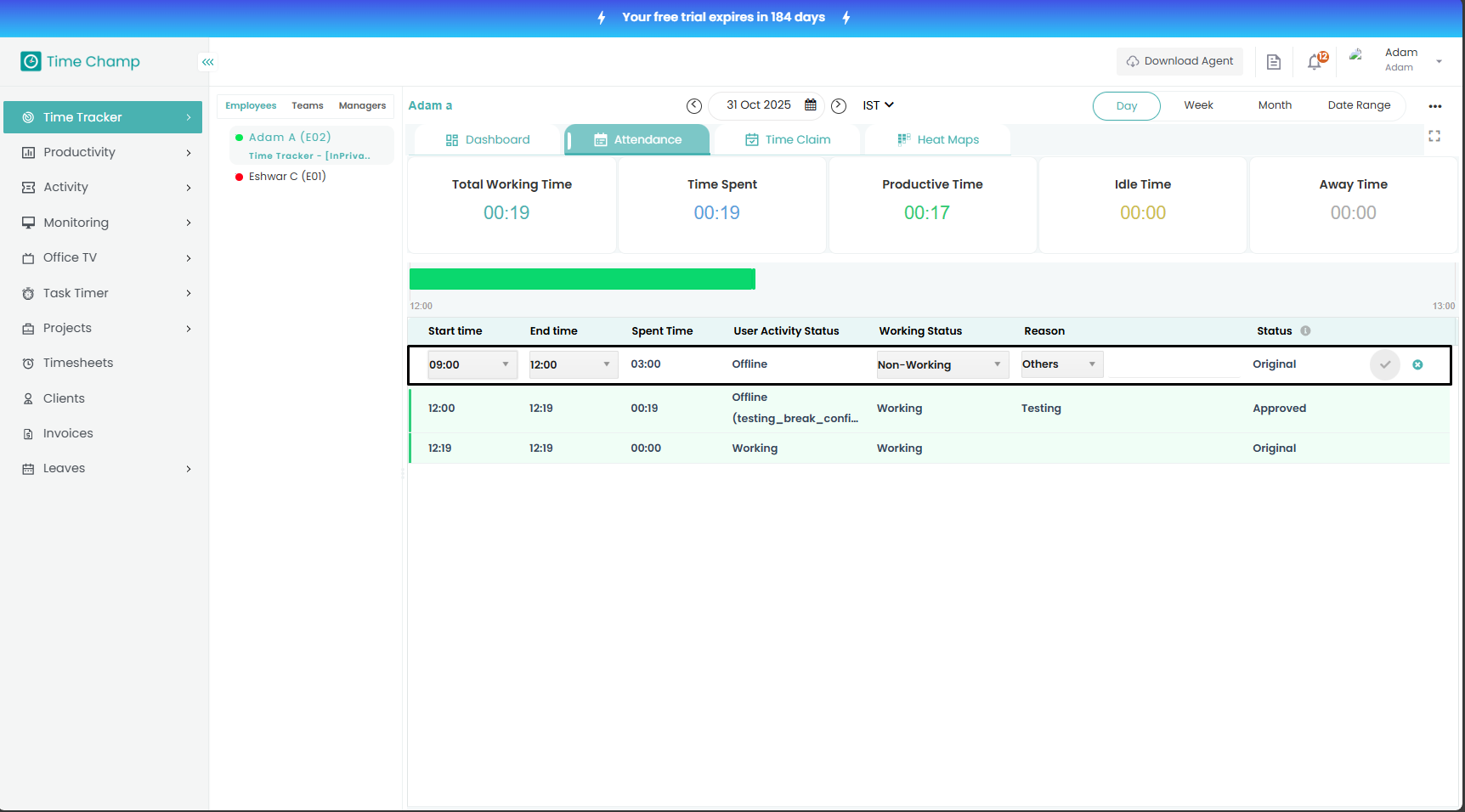 Now, select the duration for which you want to make edits, either for the entire instance or a specific split from the instance in the drop-down menu. Then choose the working status (working or non-working), select a reason, provide a description, and click the check mark to edit the time.