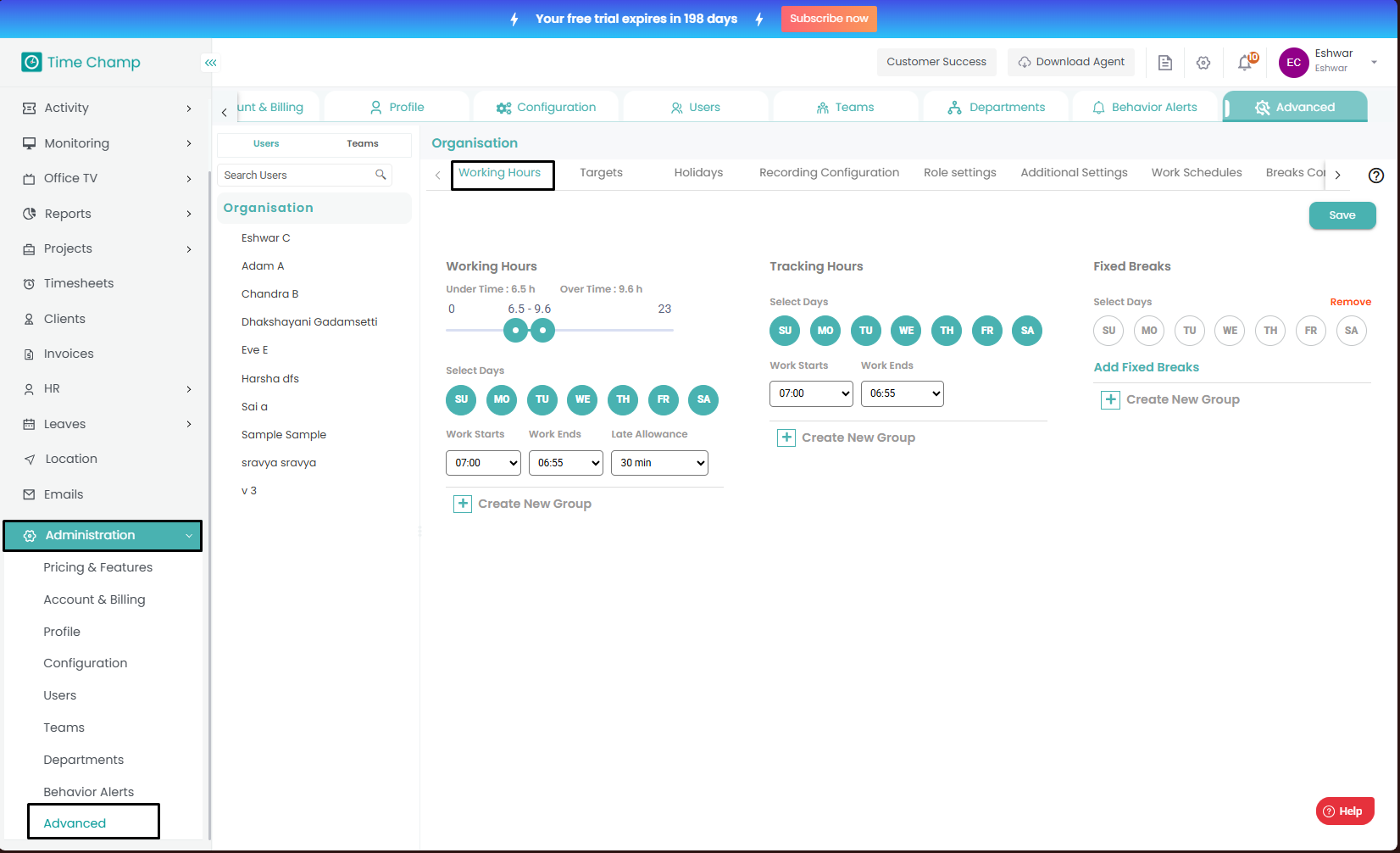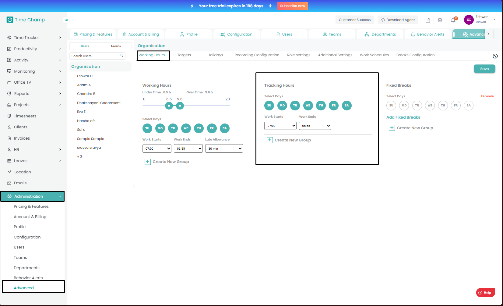 Working Hours sub section as shown in the image below.