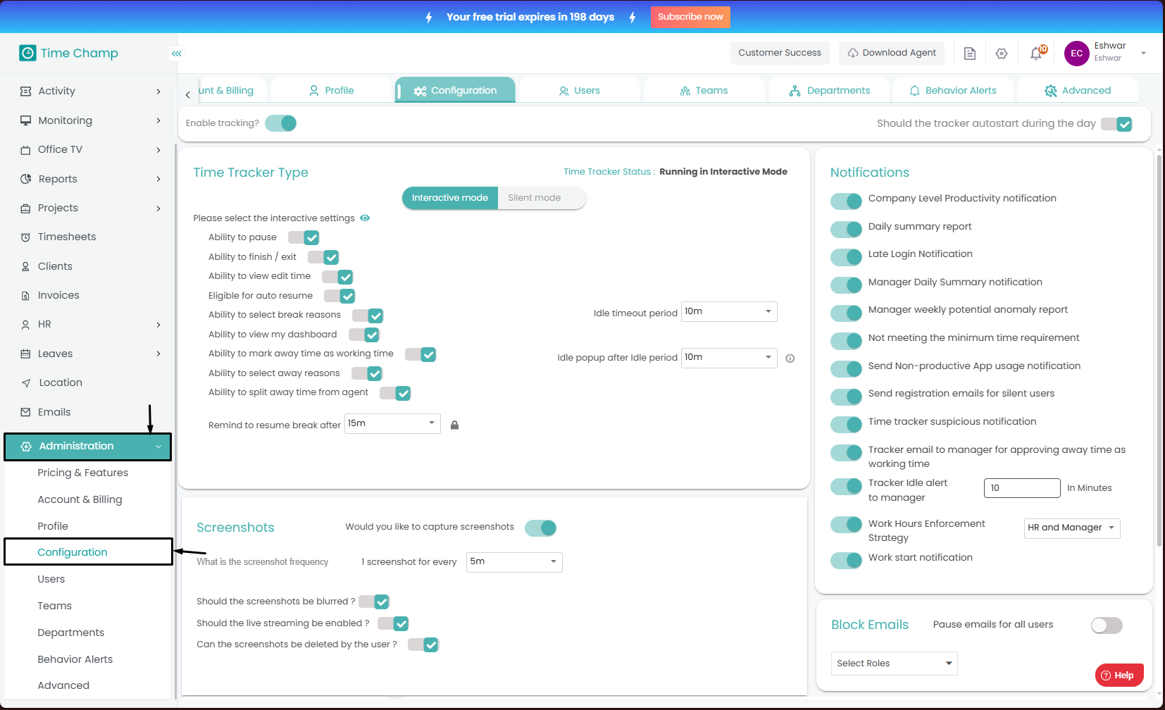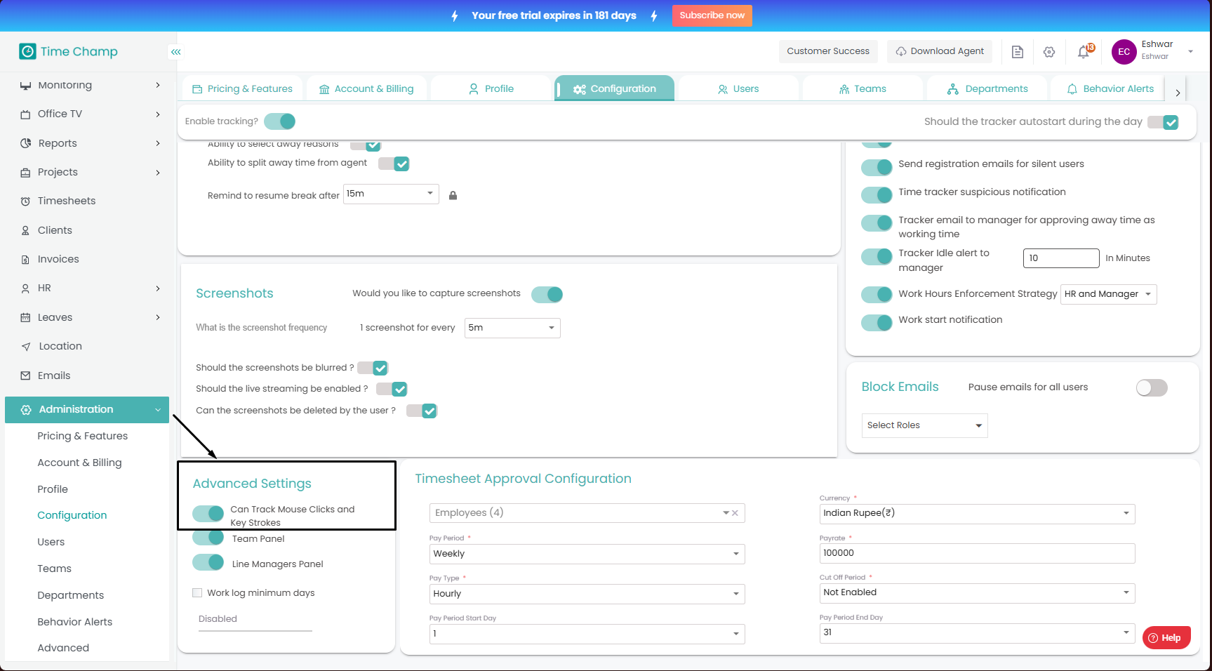 Now you can toggle the Enable/Disable Keystrokes and Mouse Click Tracking as shown in the highlighted area in the below image.
