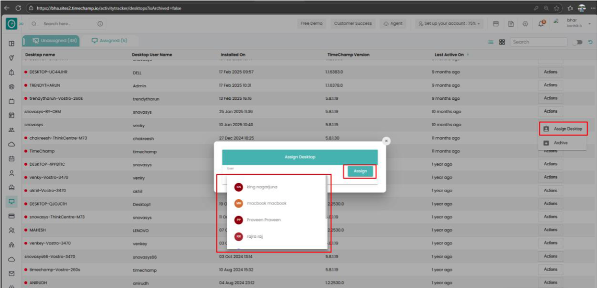 assign the desktop. After selecting the appropriate user, click on the Assign button to