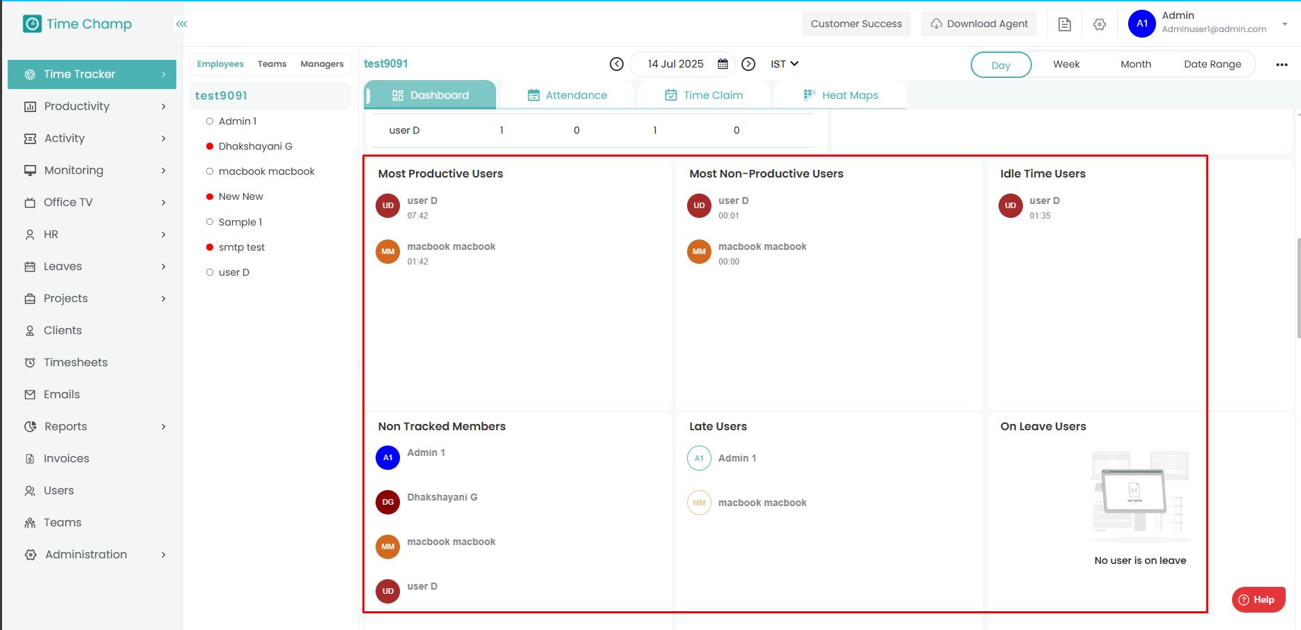 Step 1: Login to your Time champ account with credentials. Step 2: Navigate to Time tracker. Step 3: Navigate to Attendance tab. Step 4: Select organization in the user level. Team Count: The total number of members in the organization. On Leave: It ...
