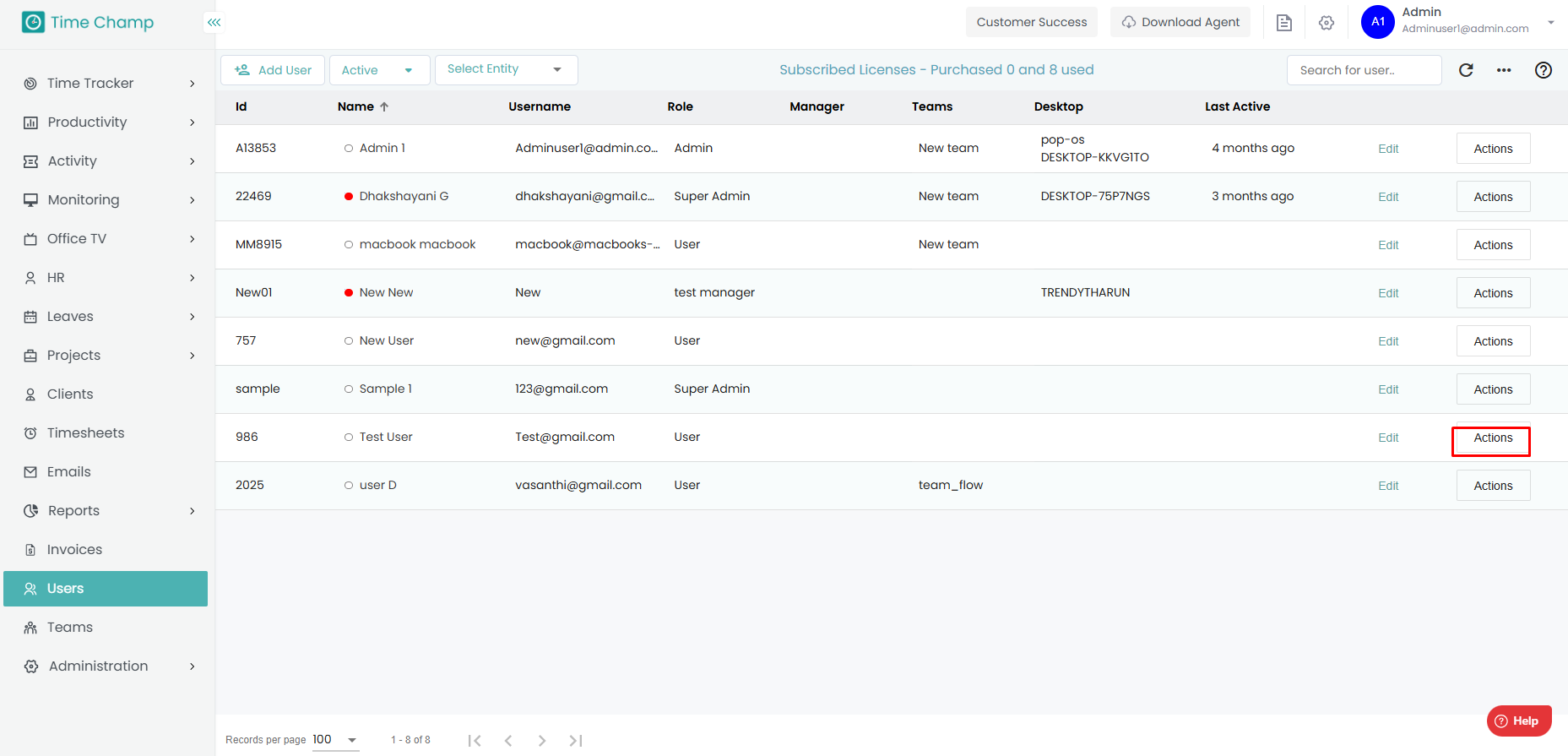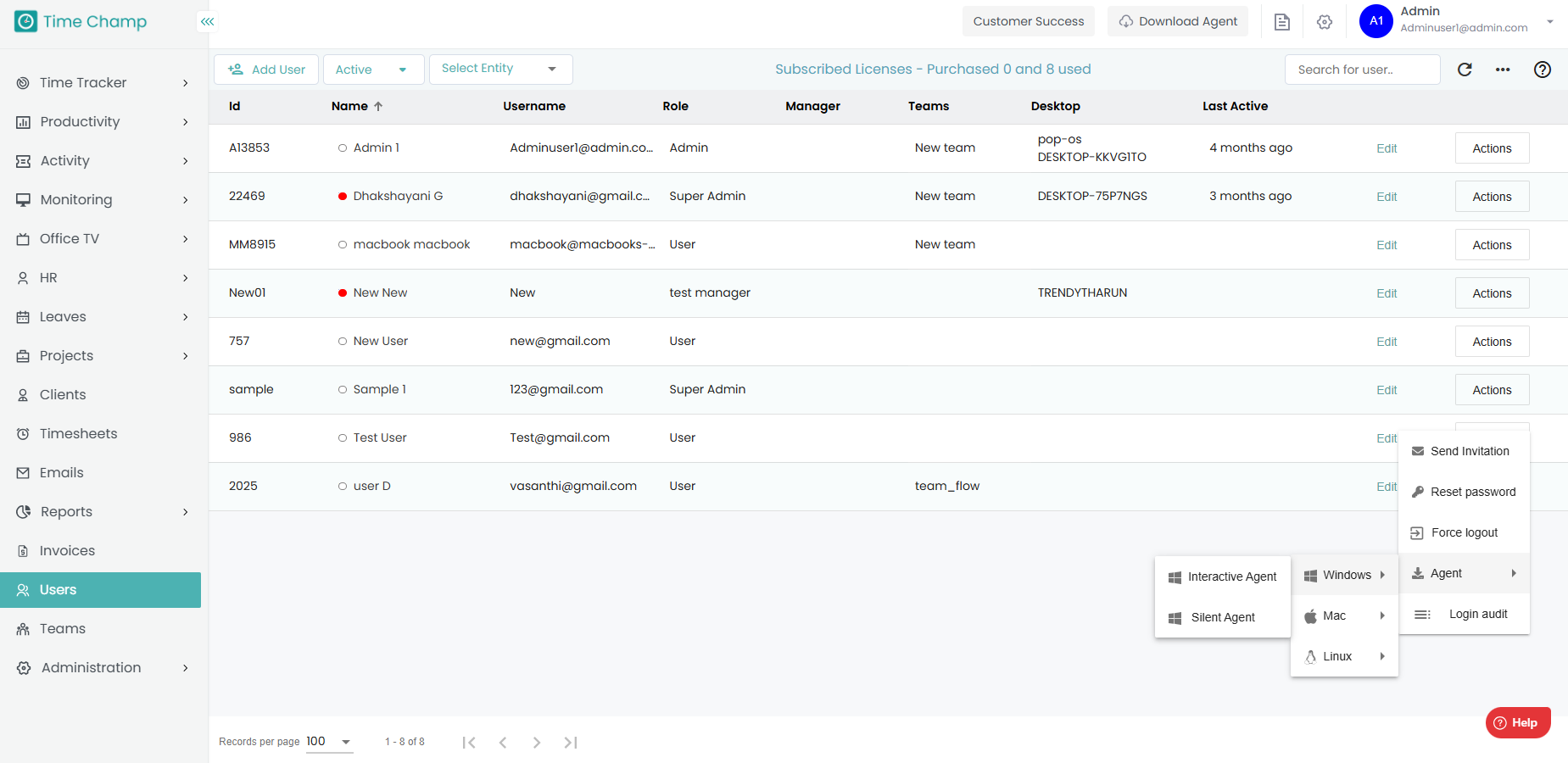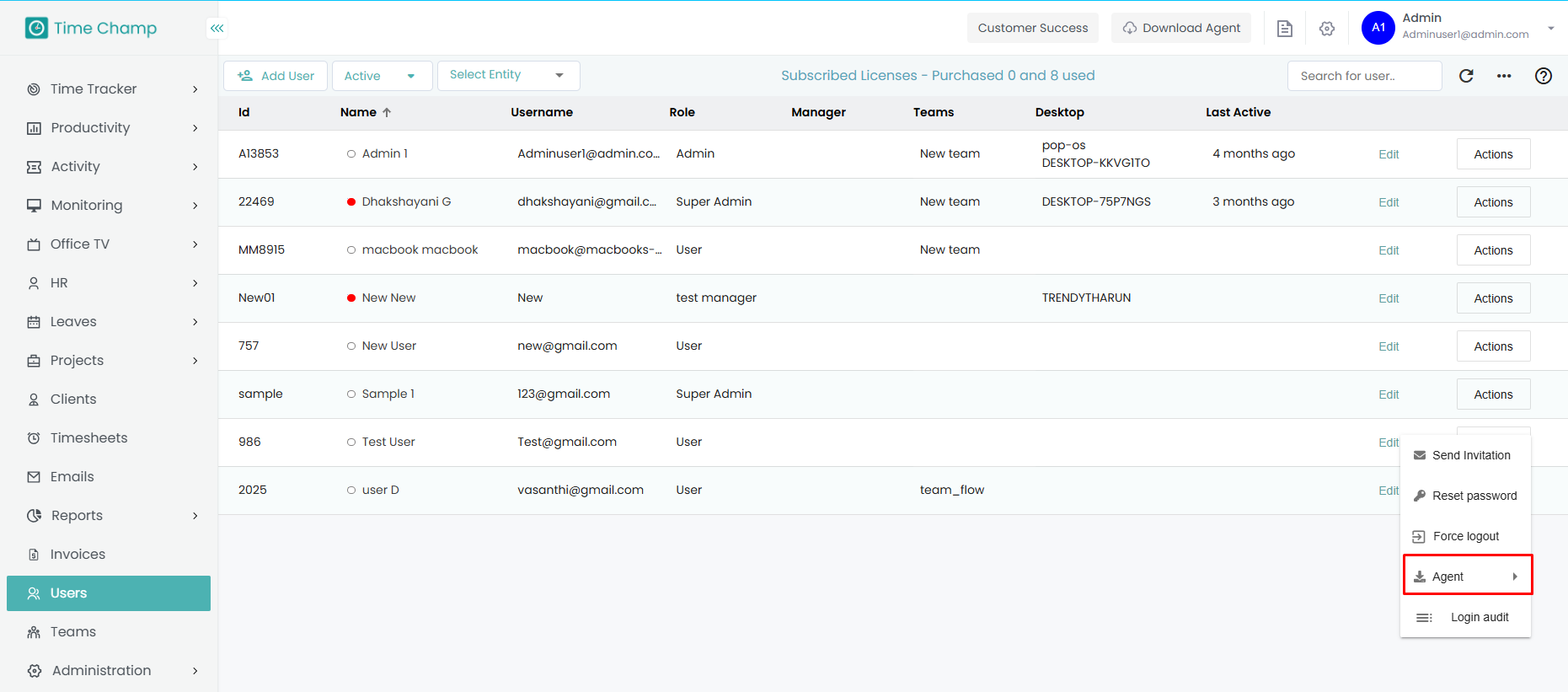 Step 2: Click on the Actions tab beside the user for whom you want to install the agent.