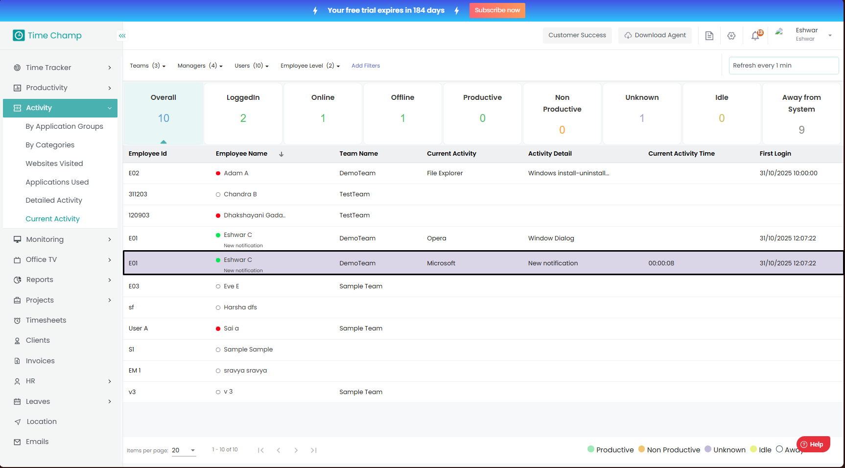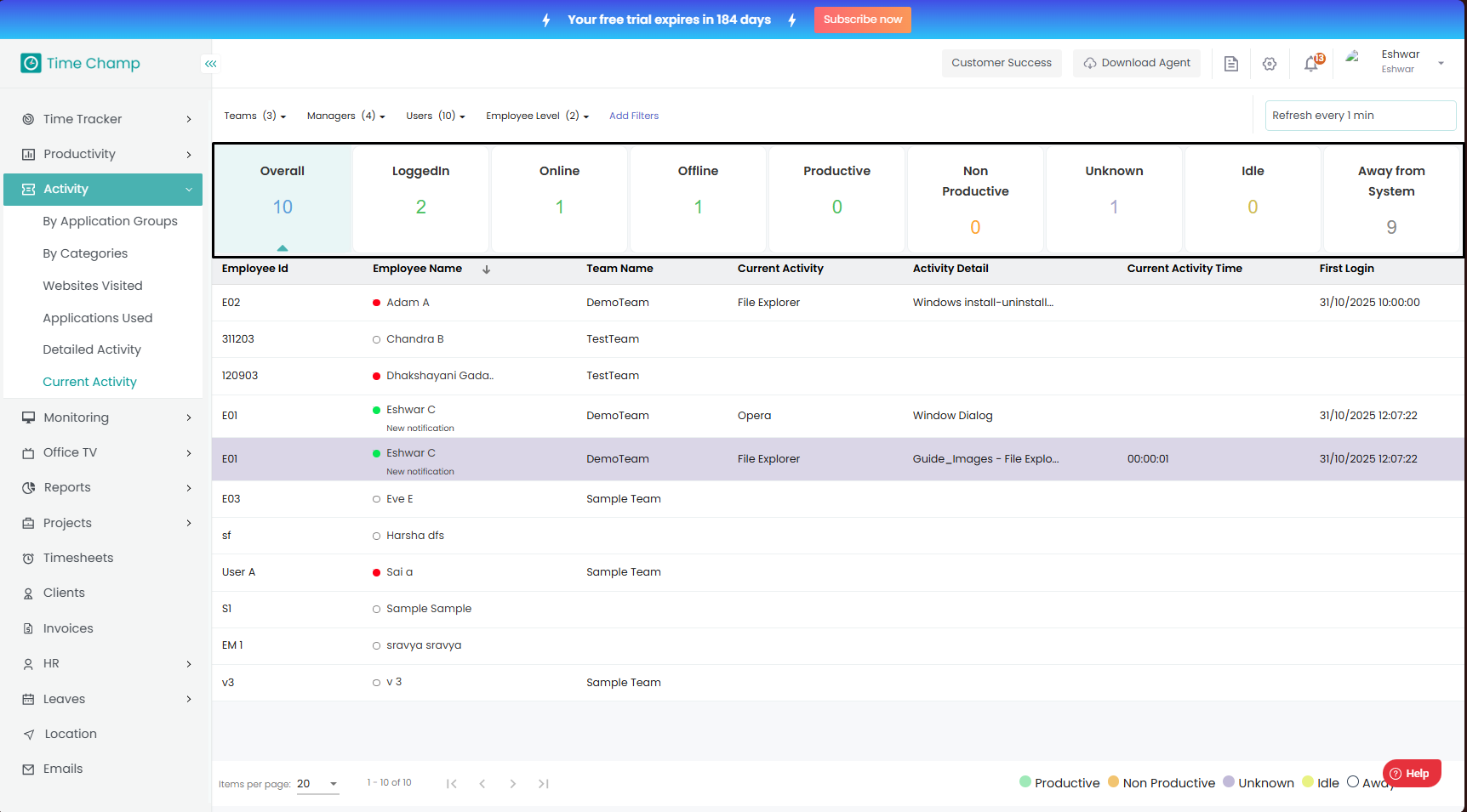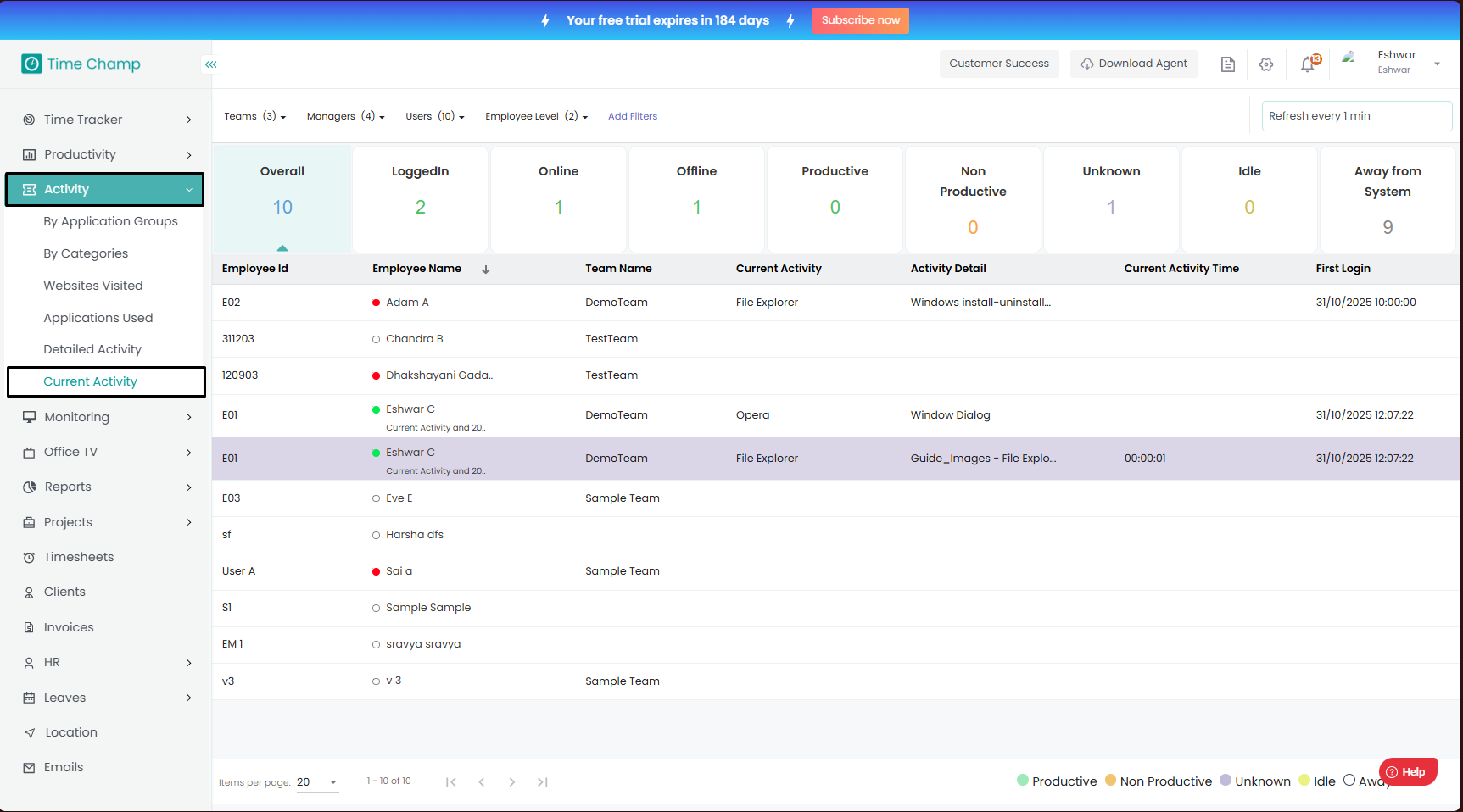 Here in Current Activity, you can view the total number of users along with their status such as logged in, online, offline, productive, non-productive, unknown, idle, or away from the system.