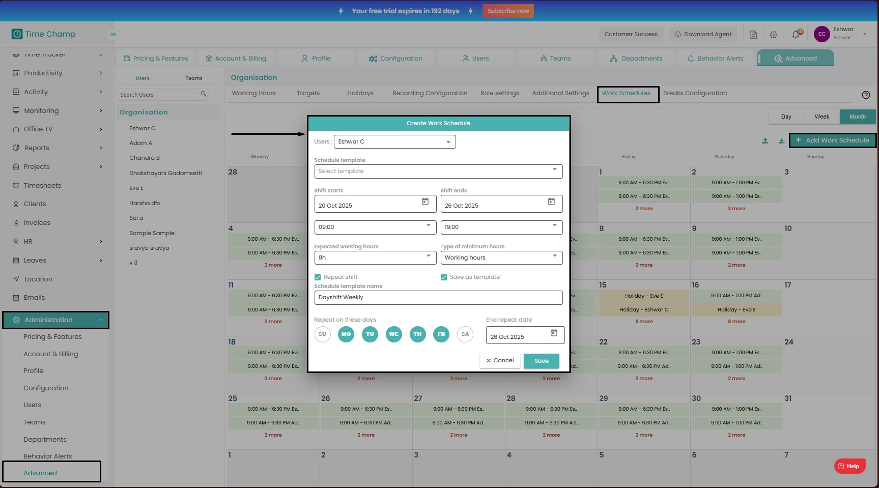 Enter the required details in the highlighted area in the below image and save it to setup work schedules for the users.