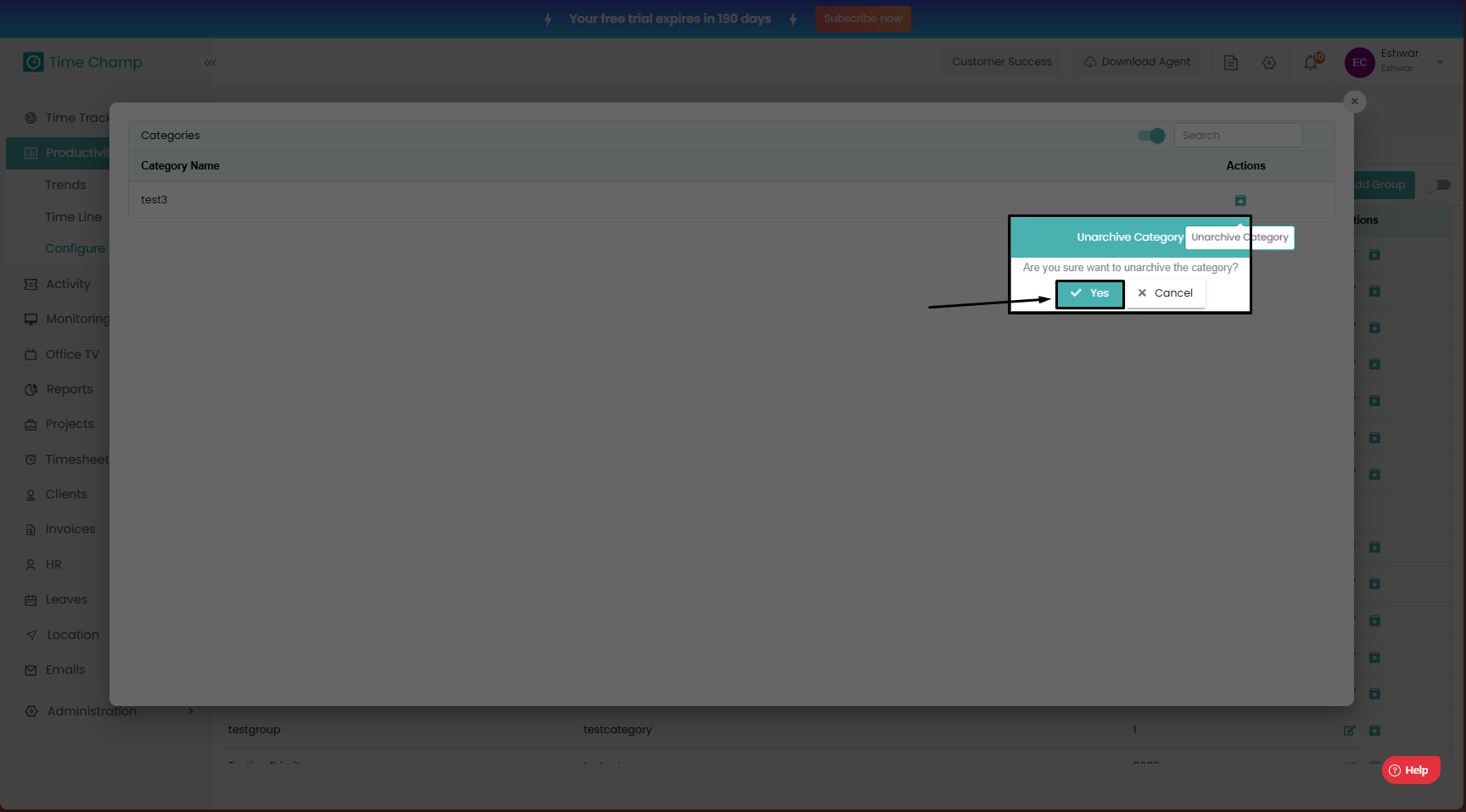 Click on yes as show in the highlighted area in the image below to unarchive the selected category.