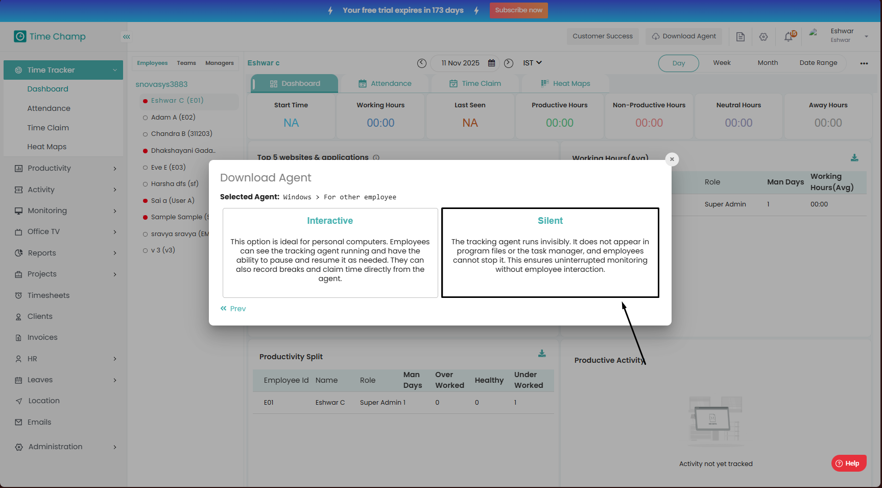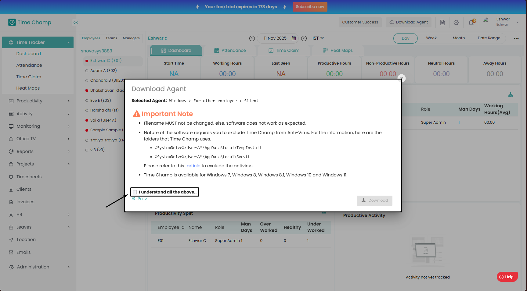 Steps to Install Time Champ V5 Interactive Version in Windows. Step 1: Log in to your Time Champ account using your credentials. Step 2: To install the application, click on “Download Agent.” Step 3: Select the operating system of your computer. Step ...