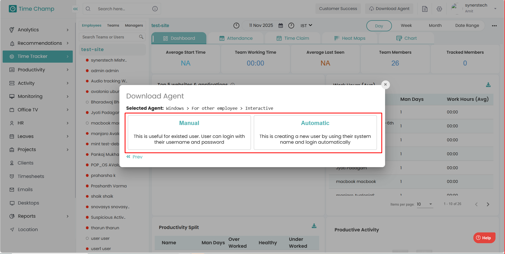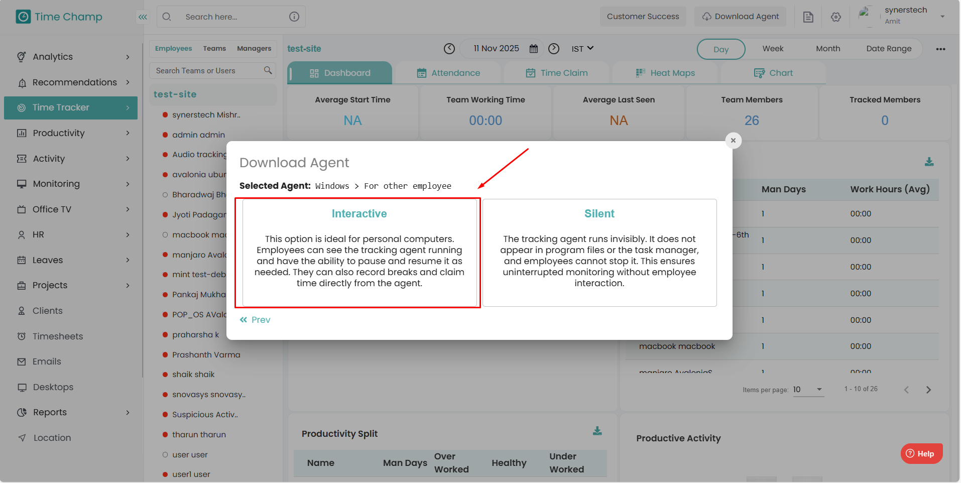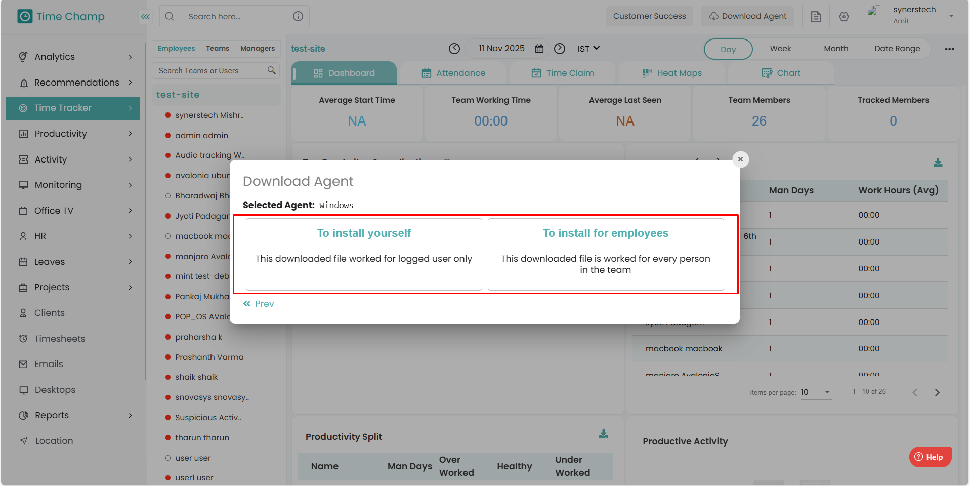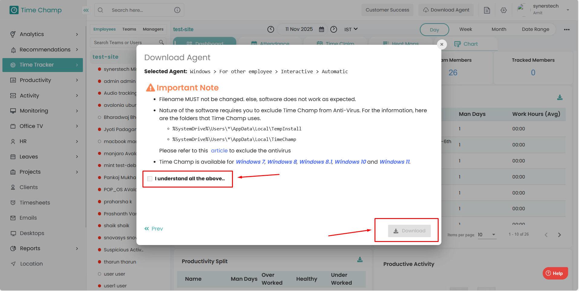 Step 1: Log in to your Time Champ account Step 2: Click on “Download Agent” to install the application. Step 3: Select the operating system of your computer. Step 4: Choose the installation type: To install yourself: Select this option if you want to ...