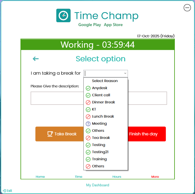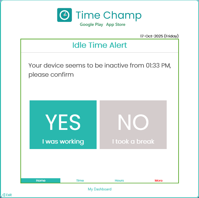 If the system detects inactivity for a predefined duration which can be set as per your organizational policy, a popup prompt will appear, allowing the employee to specify their current status either as working or away.