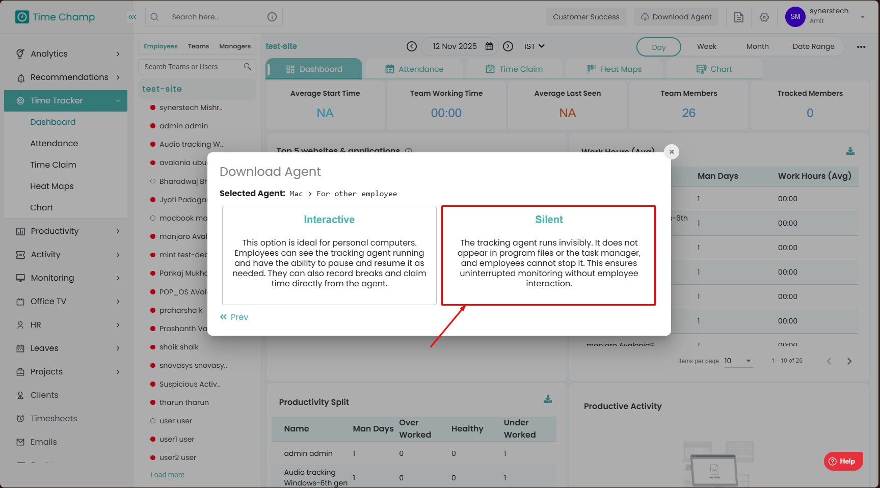 Steps to Install Time Champ V3 Silent Version in Linux System. Step 1: Log in to your Time Champ account using your credentials. Step 2: To install the application, click on “Download Agent.” Step 3: Select the operating system of your computer. Step ...