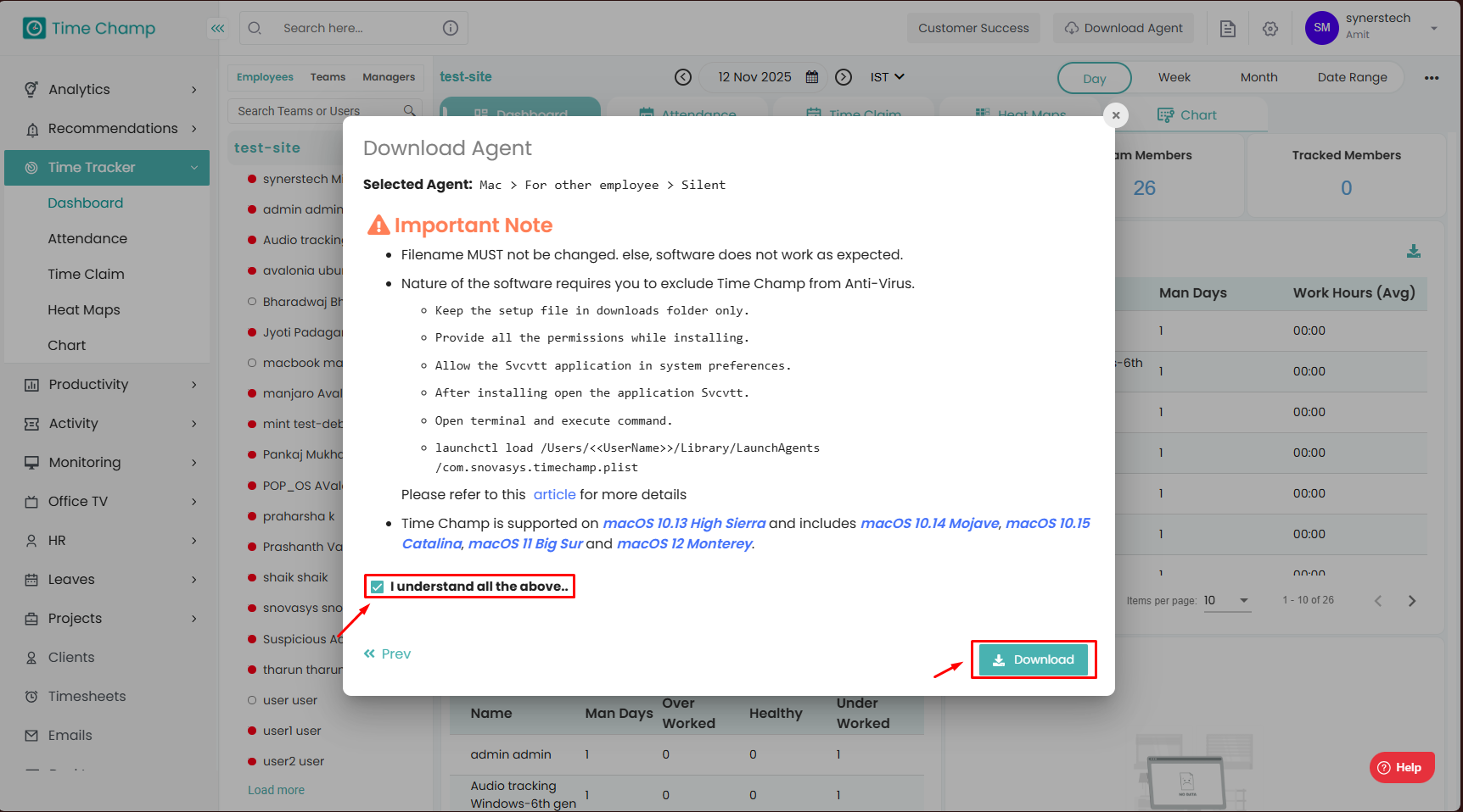Steps to Install Time Champ V3 Interactive Version in MAC System. Step 1: Log in to your Time Champ account using your credentials. Step 2: To install the application, click on “Download Agent.” Step 3: Select the operating system of your computer. ...