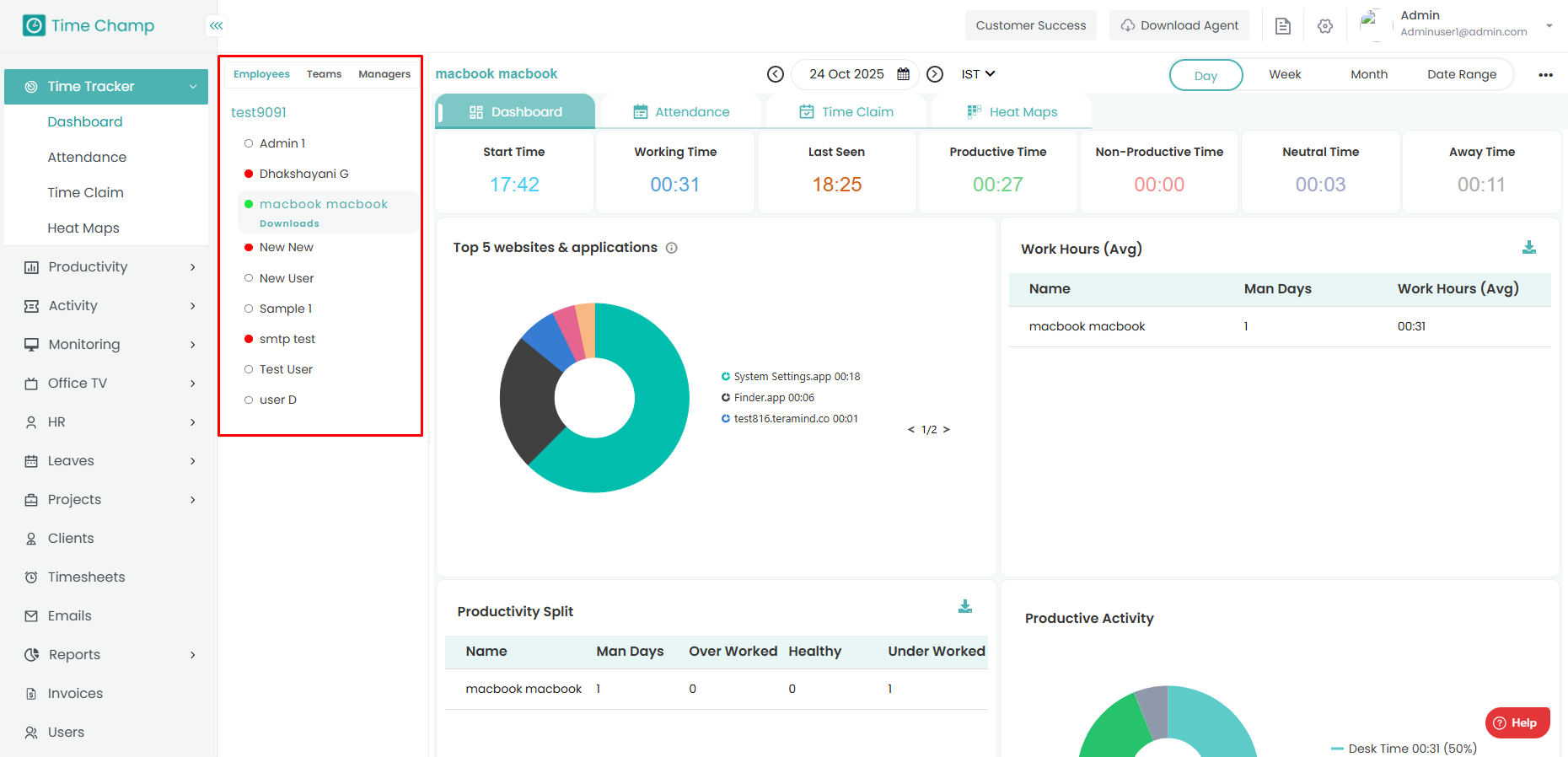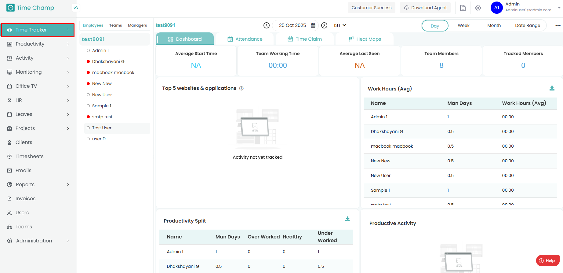Step 1: Login to your Time champ account with credentials. Step 2: Navigate to Time tracker. Step 3: Navigate to Attendance tab. Step 4: Select organization in the user level. Team Count: The total number of members in the organization. On Leave: It ...