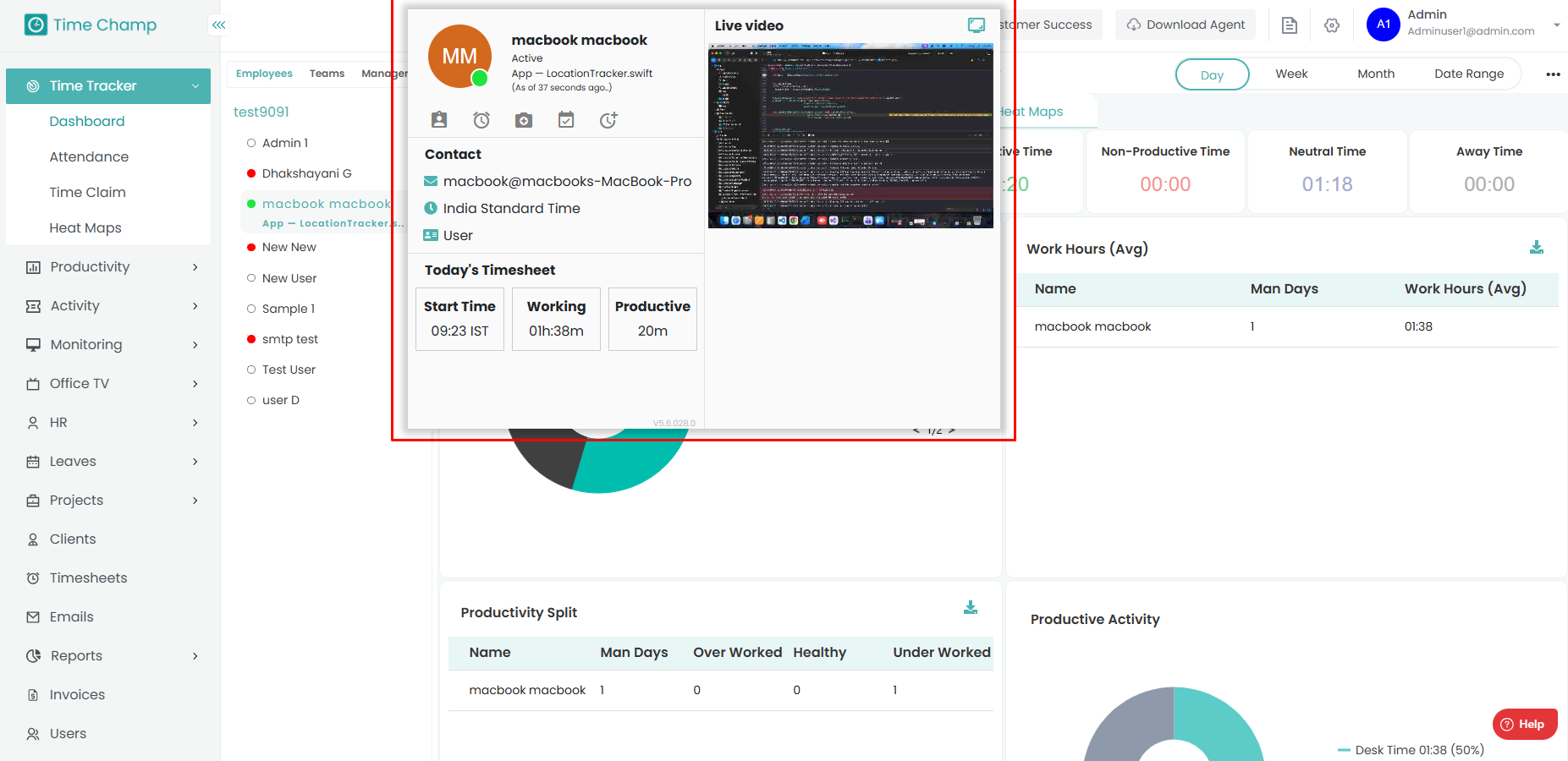 Here, you can view the employee’s timesheet for today, their activity status, and the live screen.