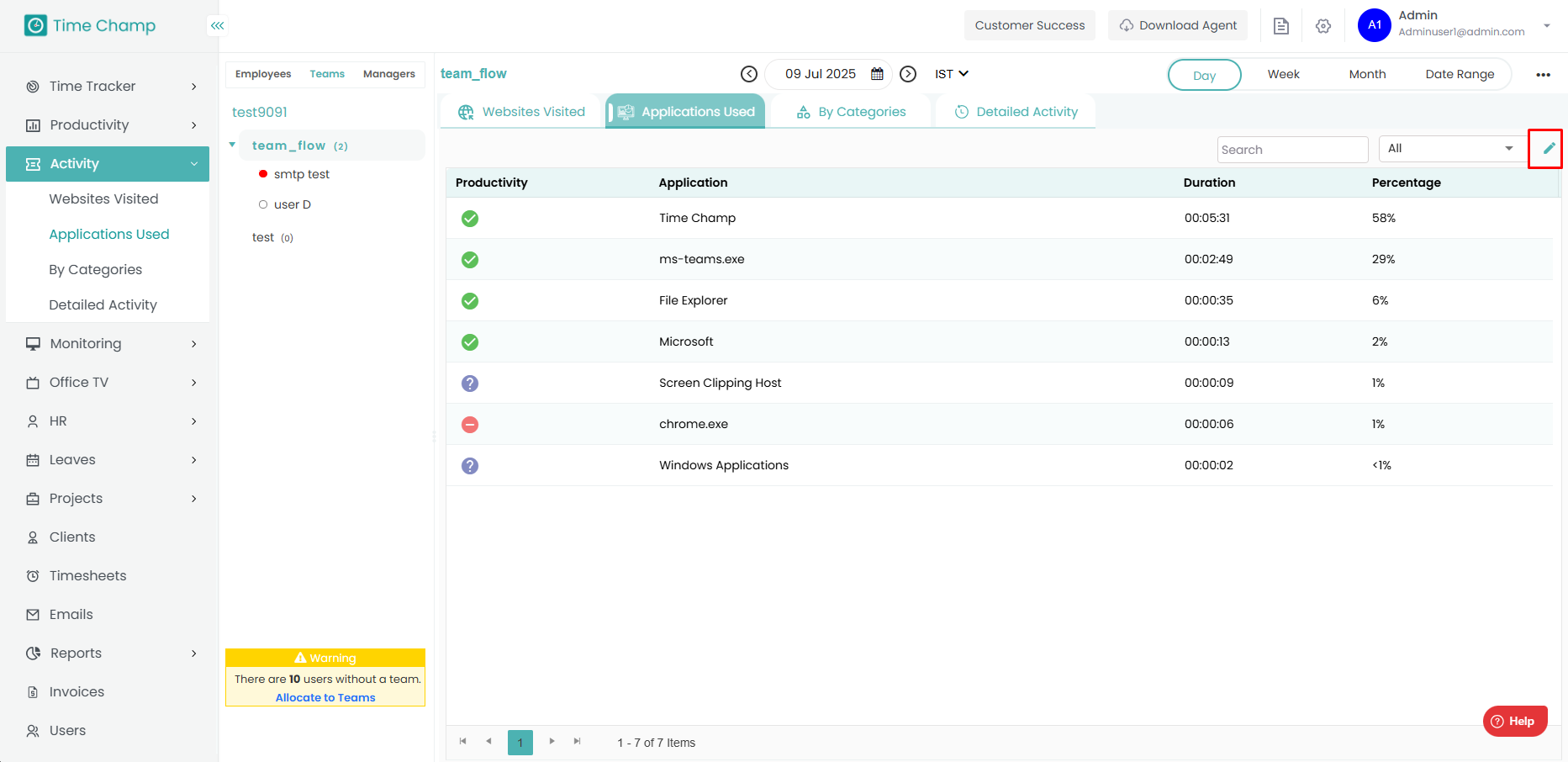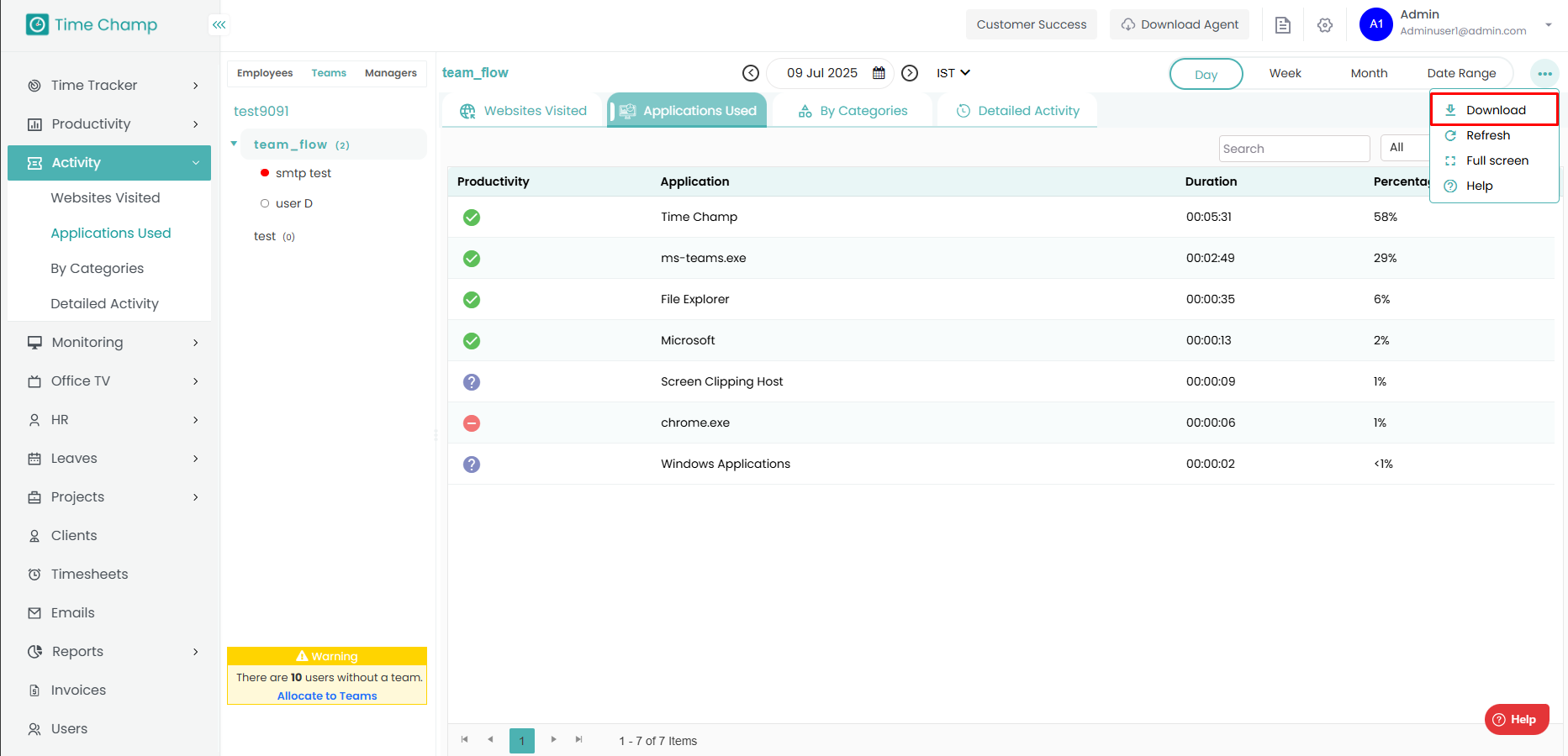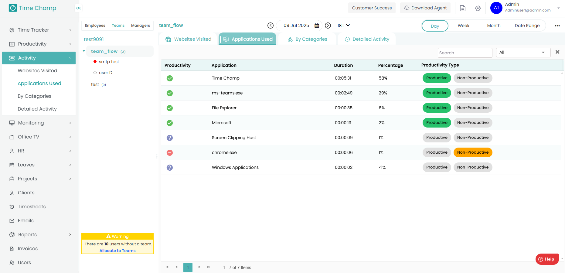 In this module, you can view detailed information about employee activities, including the applications and websites they use and the amount of time spent on each. Step 1: Navigate to Activity Module Step 2: Navigate to Applications used. Here you ...