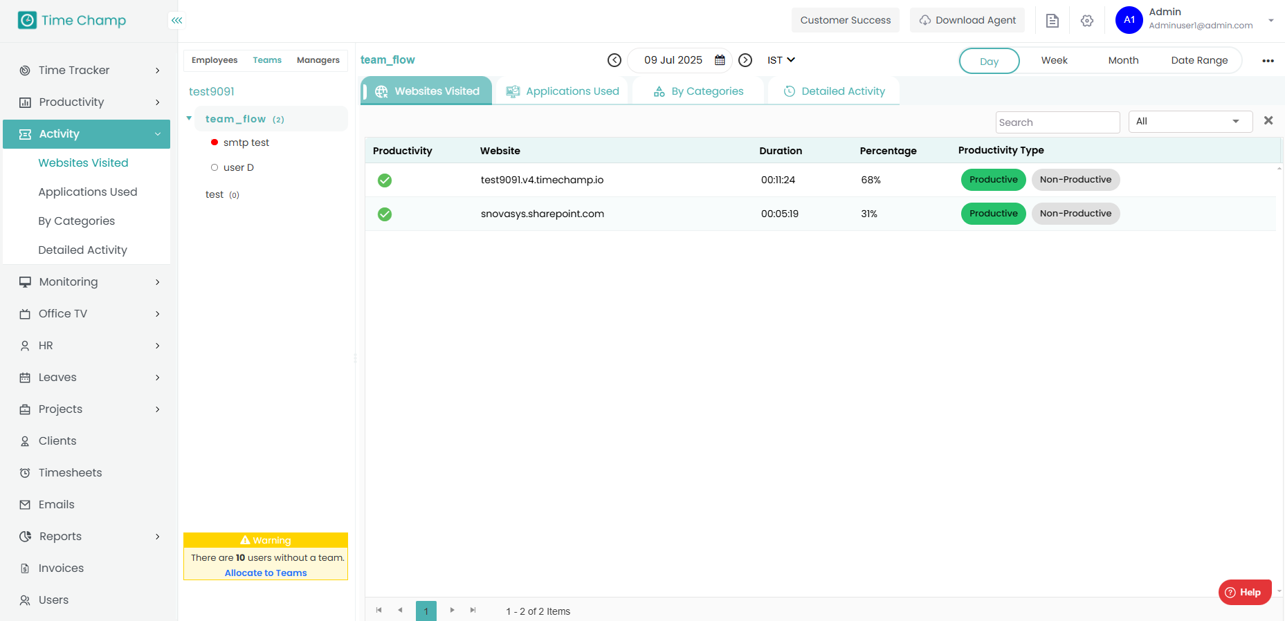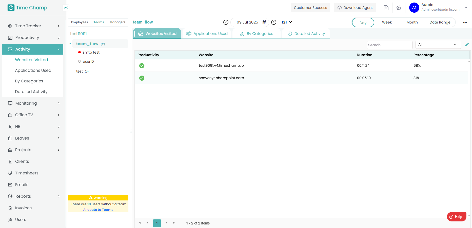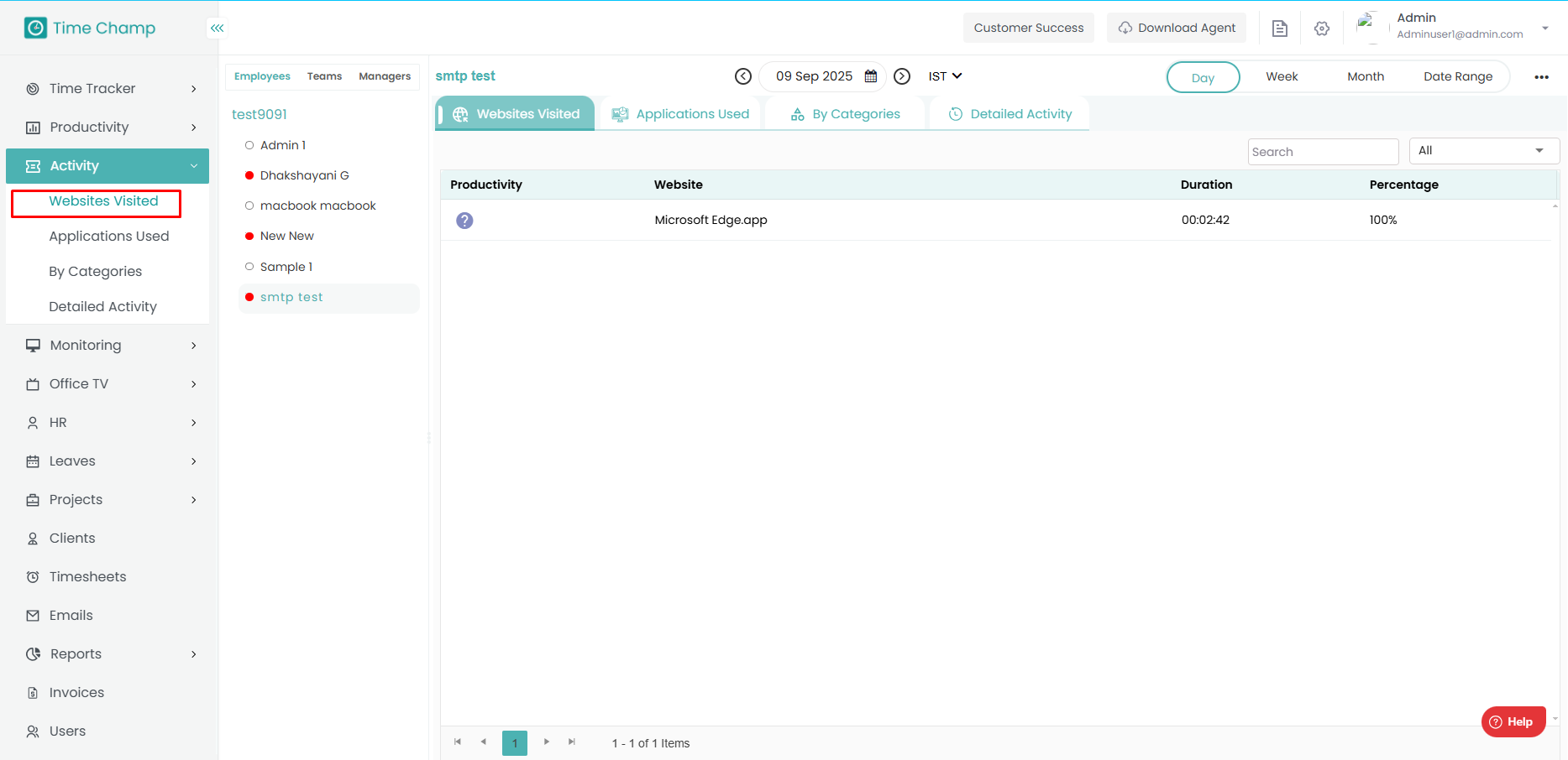 In this module, you can view detailed information about employee activities, including the applications and websites they use and the amount of time spent on each. Step 1: Navigate to Activity Module Step 2: Navigate to Websites Visited Here, you can ...