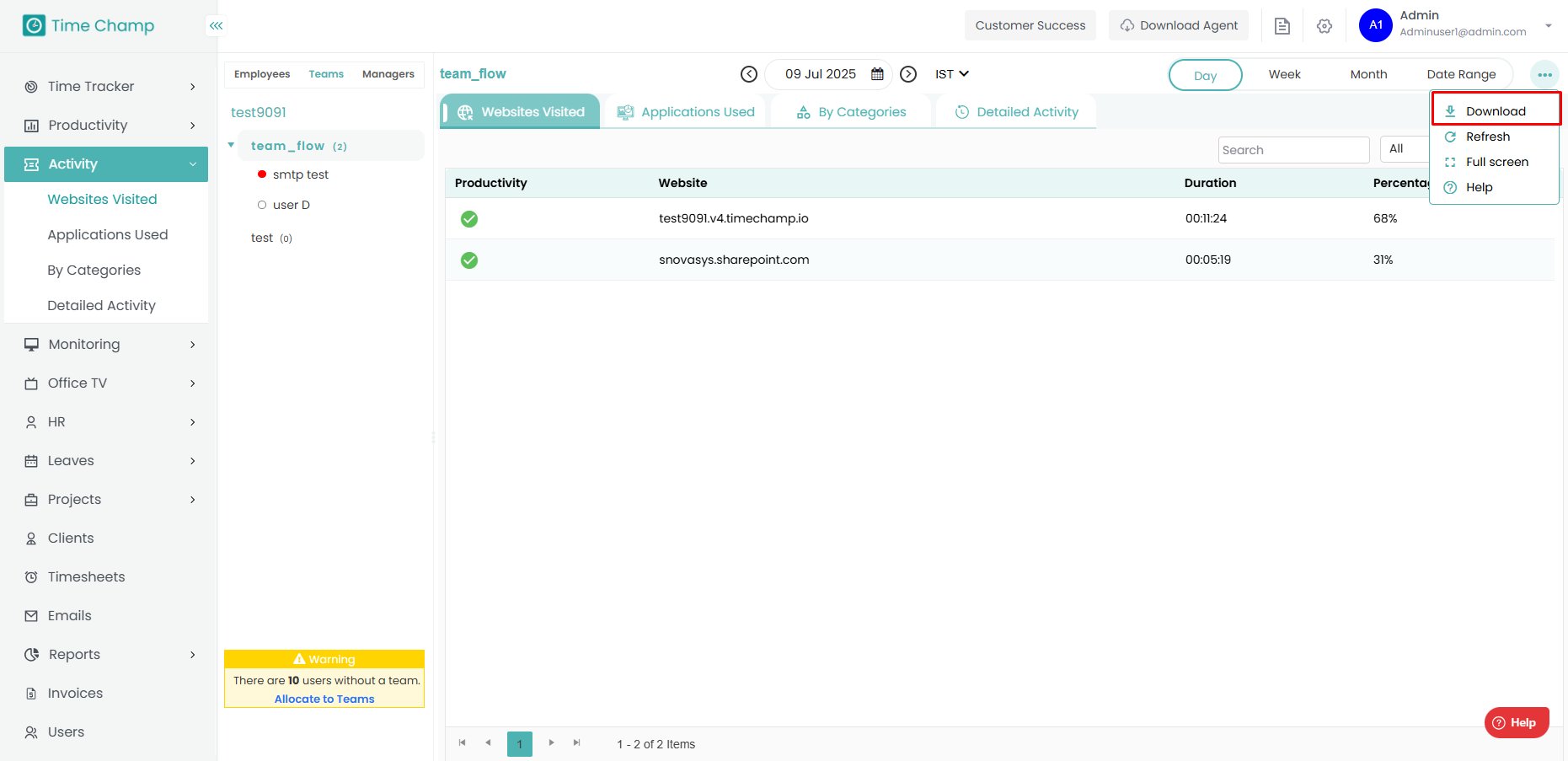 Here you can see all the websites visited by all the employees in the team along with the time spent.