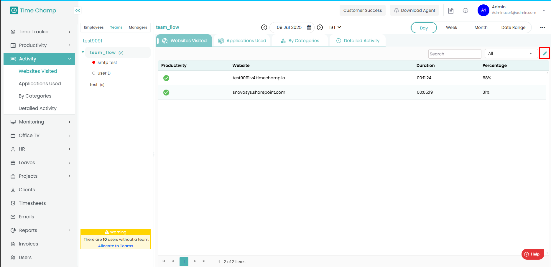 In the team level, you can also change the productivity type of websites for that particular team by click on the edit icon.