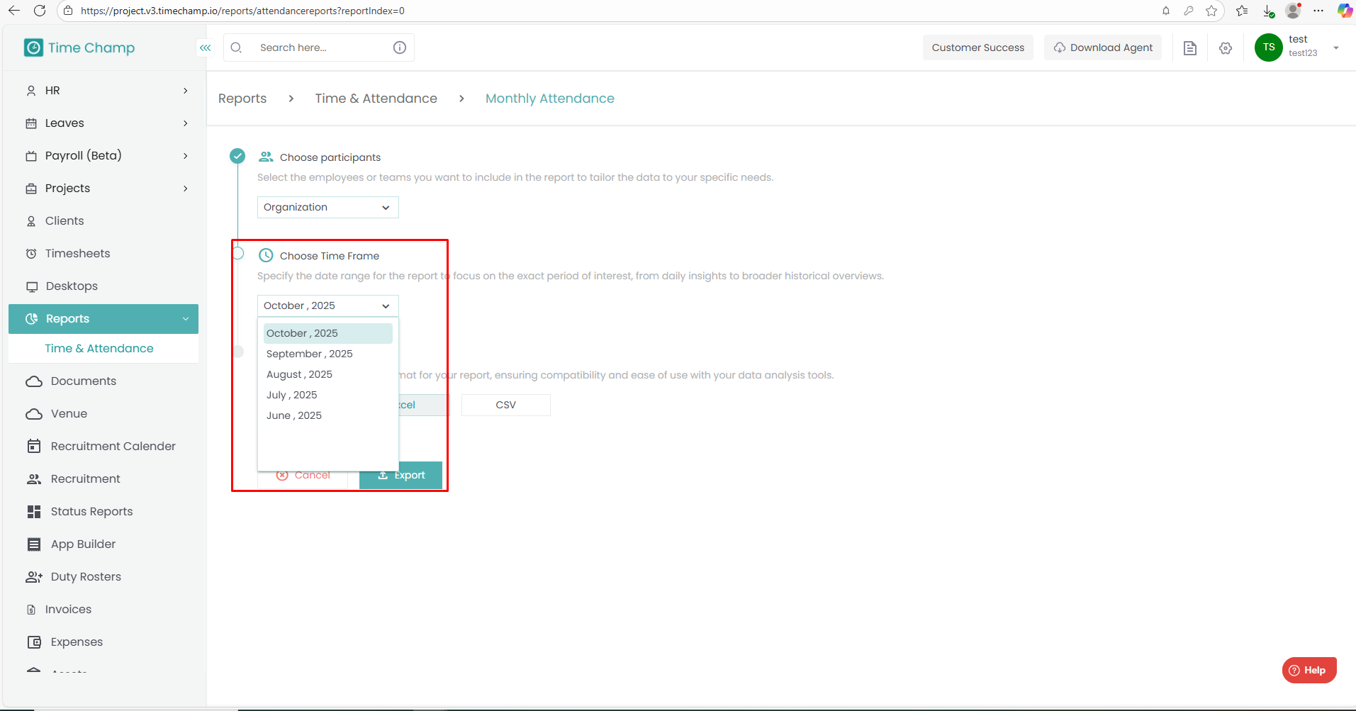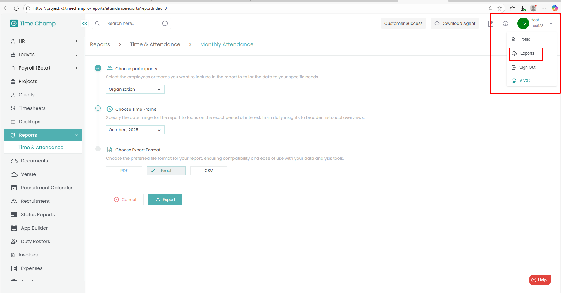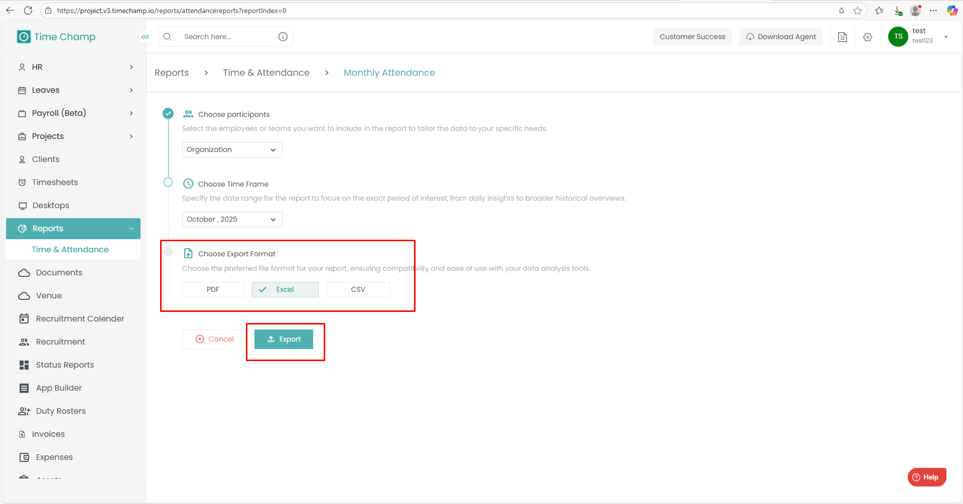Export — the report will be generated and queued for download.