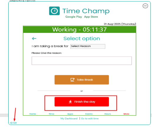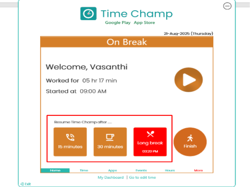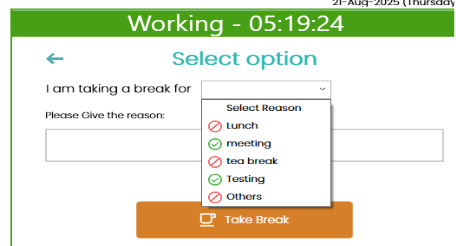 Ability to select break reasons: The employee can select break reasons while taking break.