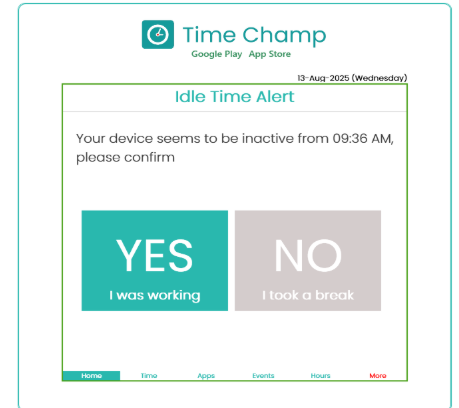 Ability to mark away time as working time: After being idle for certain period of time, the employee can see a popup