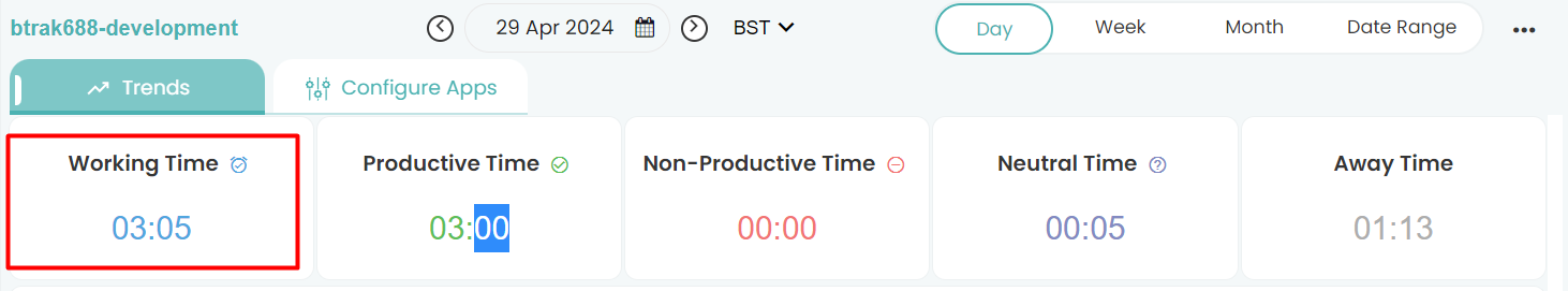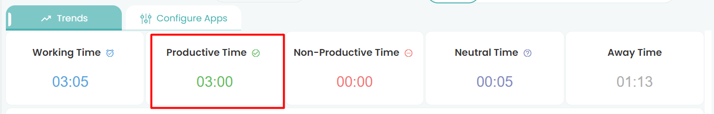 Displays the total time worked by the user, including both productive and non-productive activities.