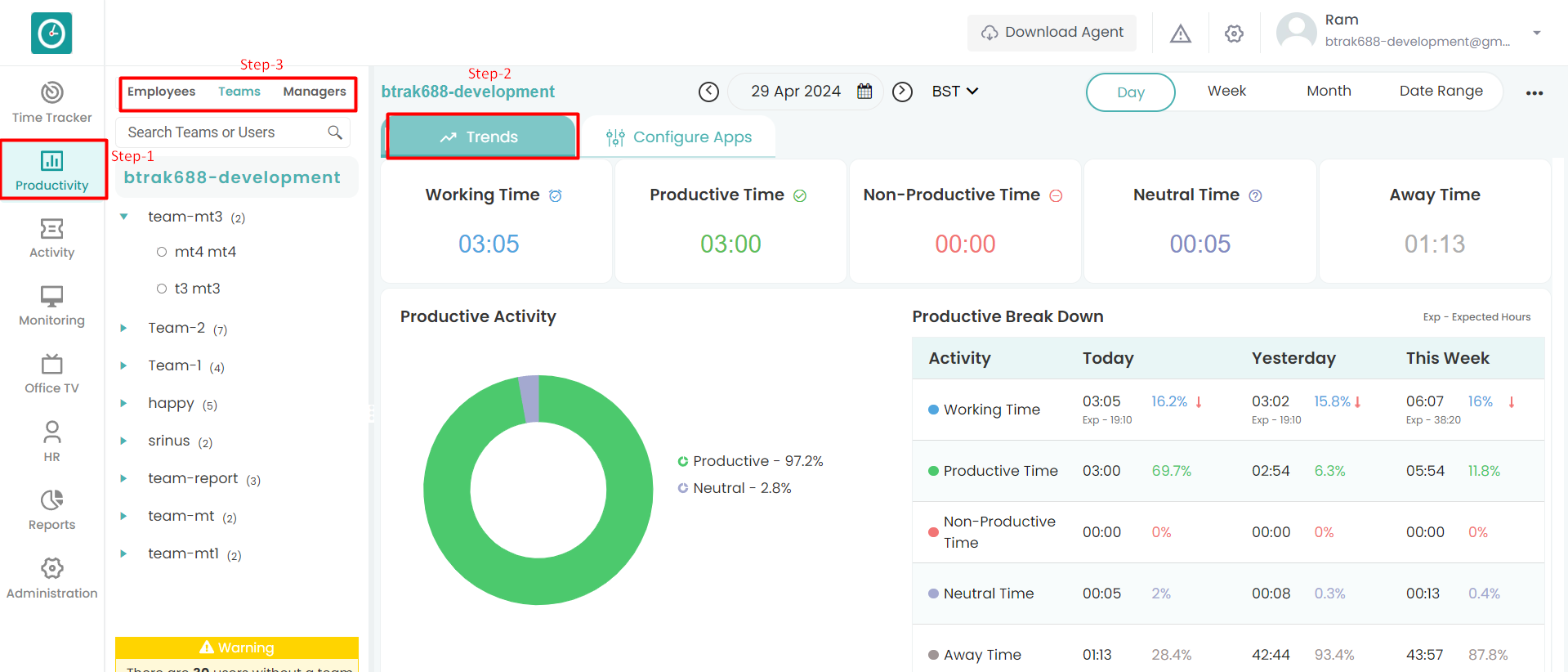 Follow the steps below to navigate and understand the Trends section under the Productivity module in Time Champ: