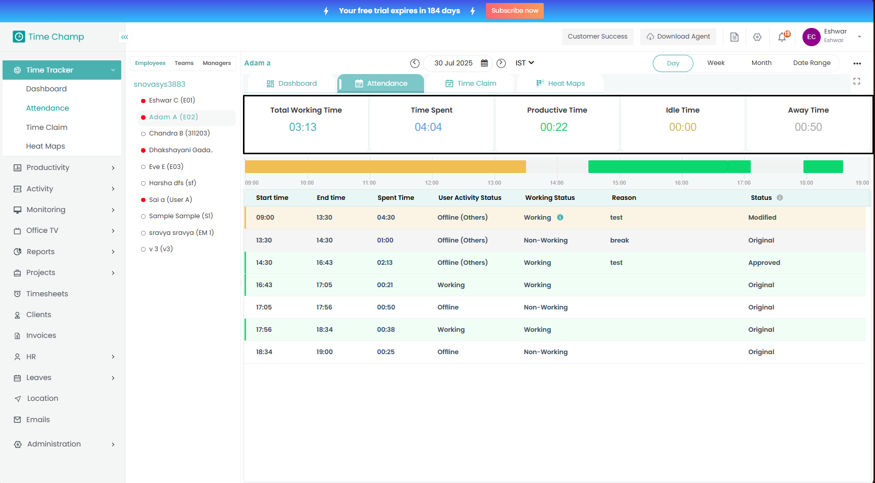 Follow the steps to edit time of a user in Attendance Module. Step 1: Log into the site utilizing your credentials. Step 2: Navigate to the Time Tracker Module and then to the Attendance section. Step 3: Here you can view the attendance data and to ...