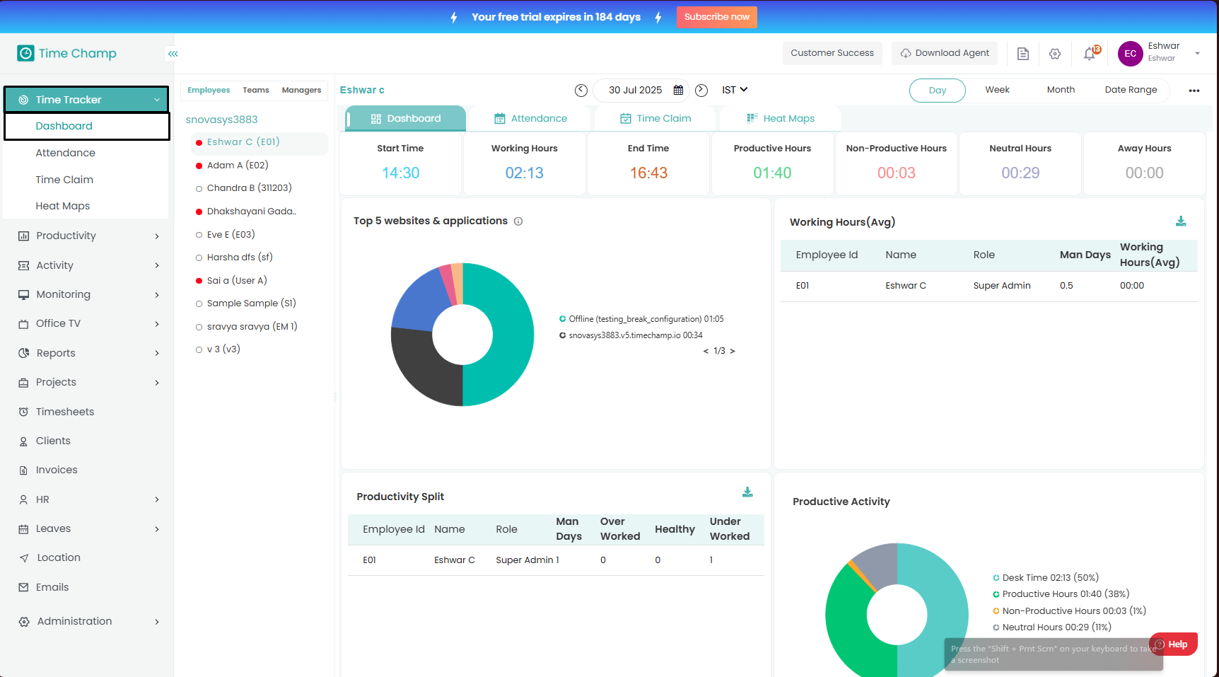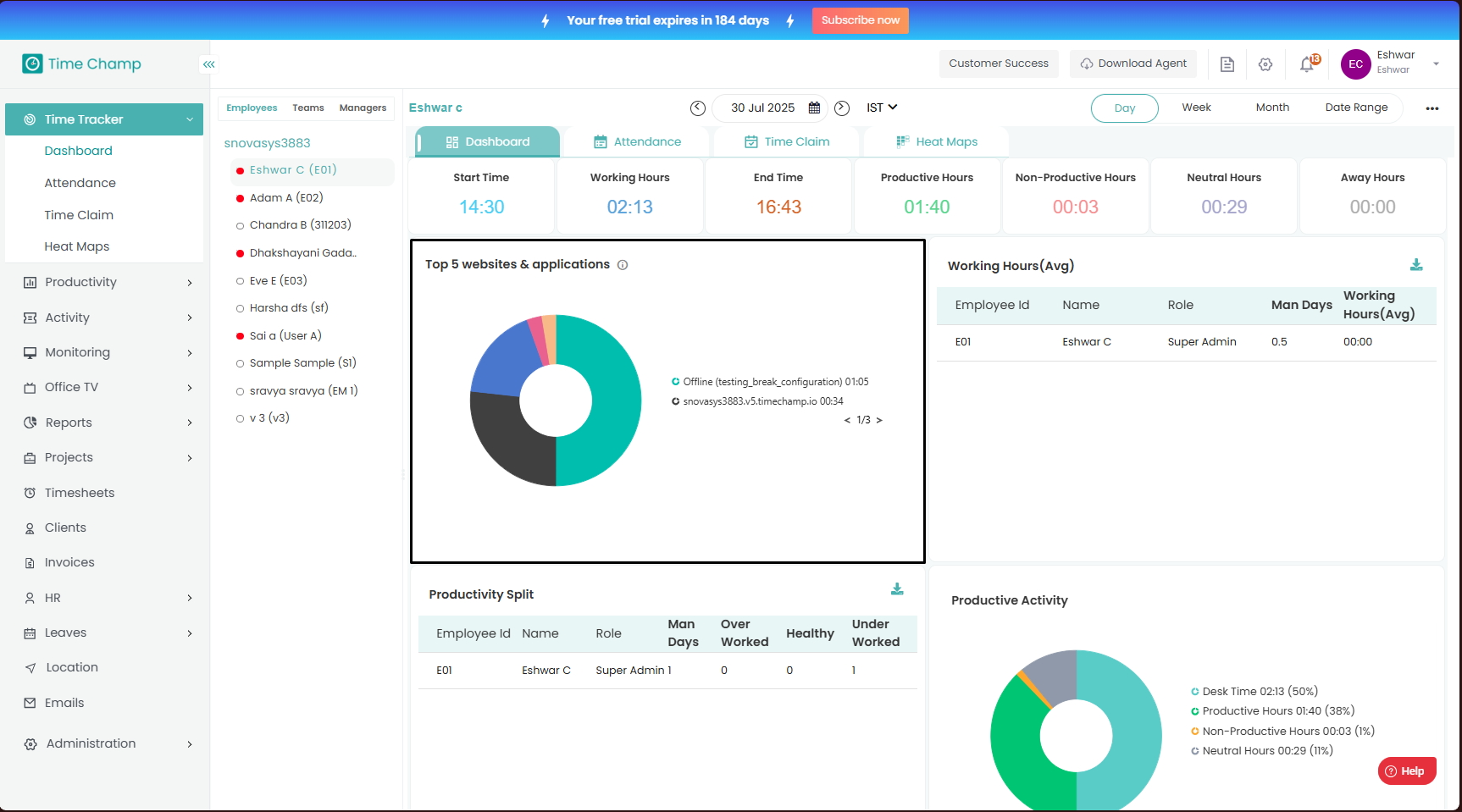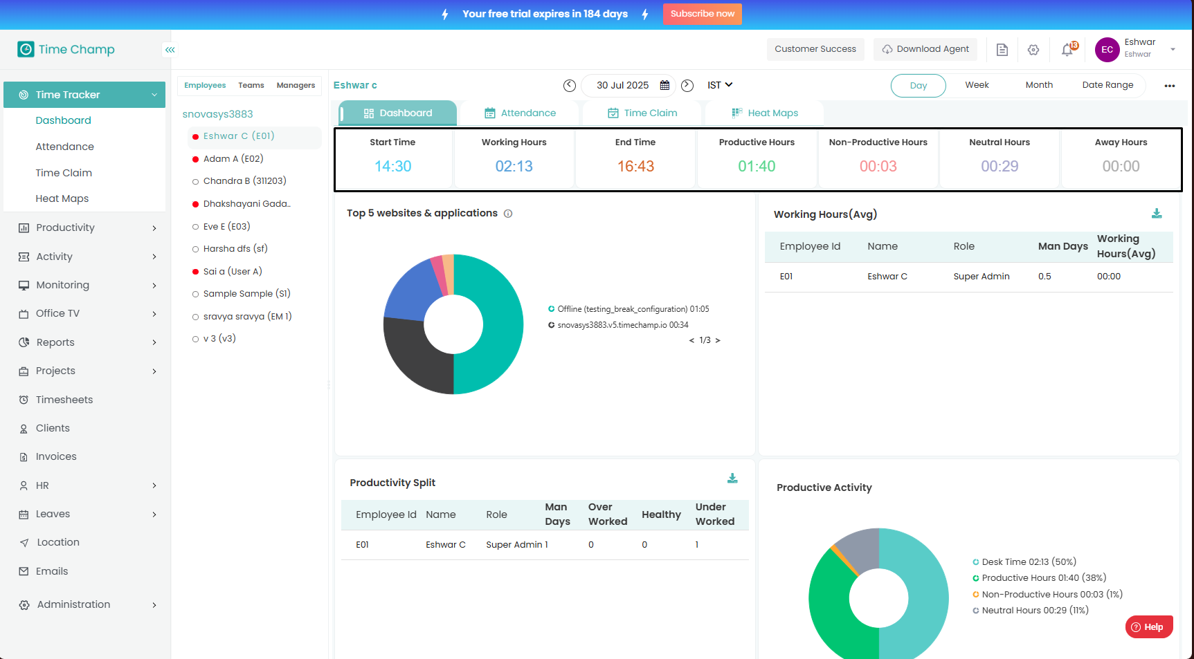 The Dashboard provides a complete overview of employee activity and productivity.