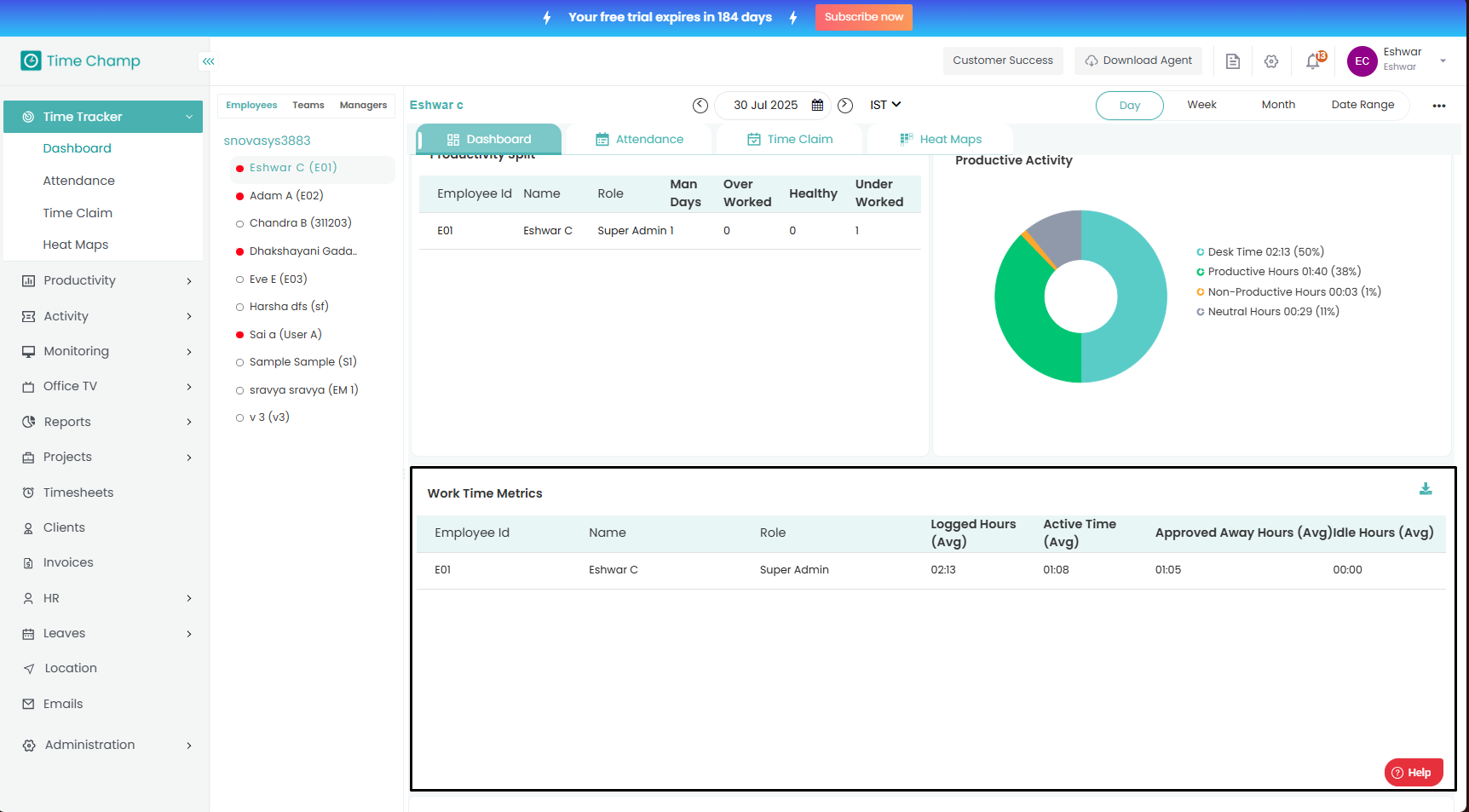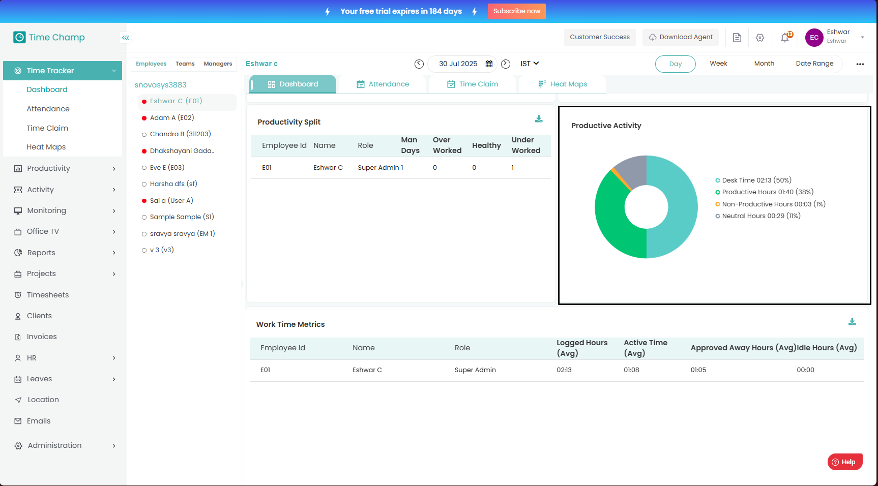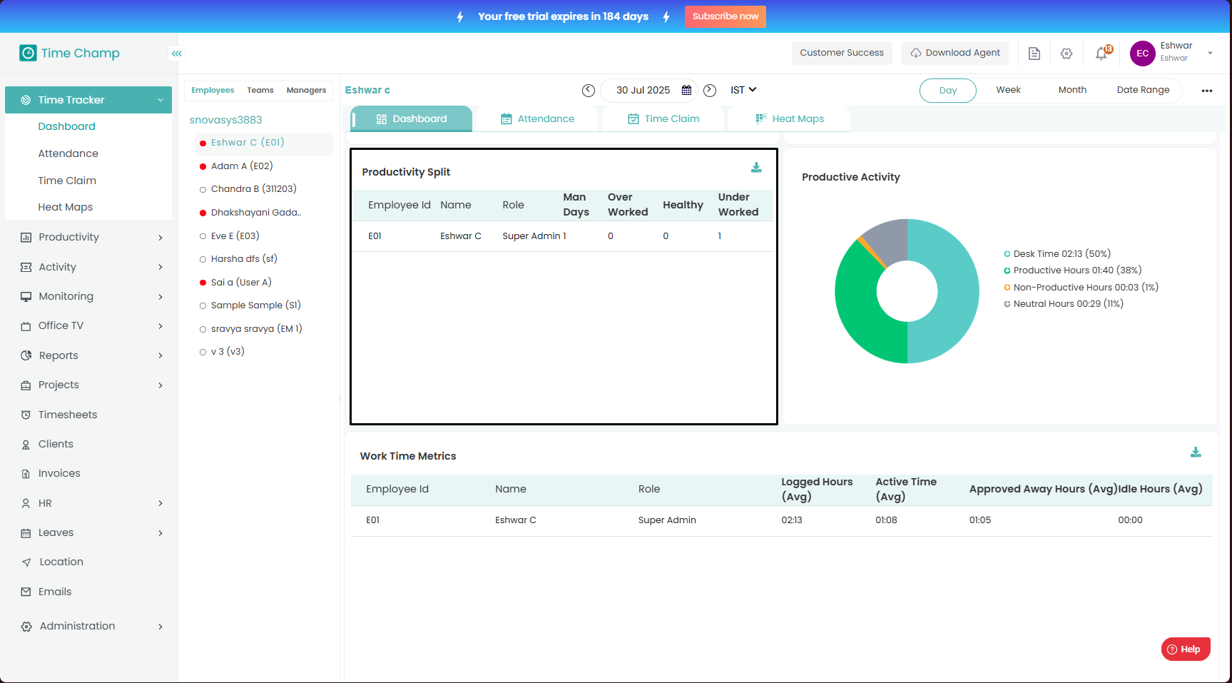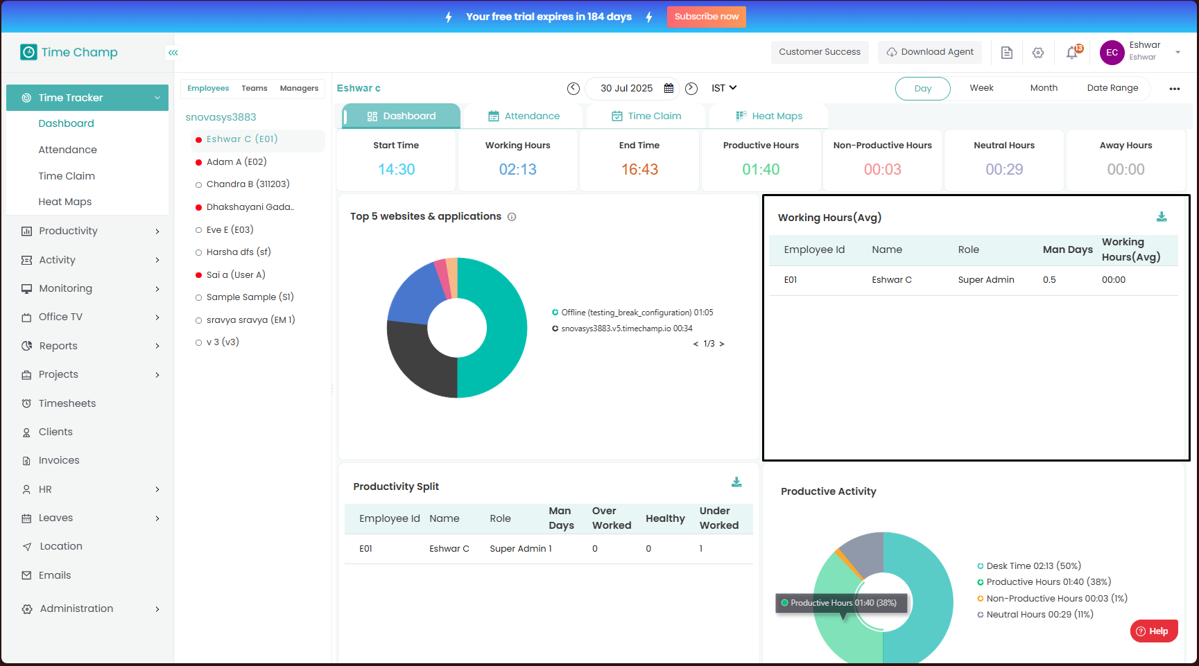 The Dashboard provides a complete overview of employee activity and productivity.