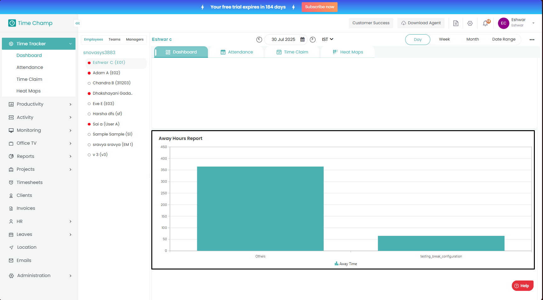 Here you can view the work time metrics of the employee which provide data on the logged hours, active time, approved away time and away hours as shown in the highlighted area of the below image and the download option will generate a sheet containing this data.